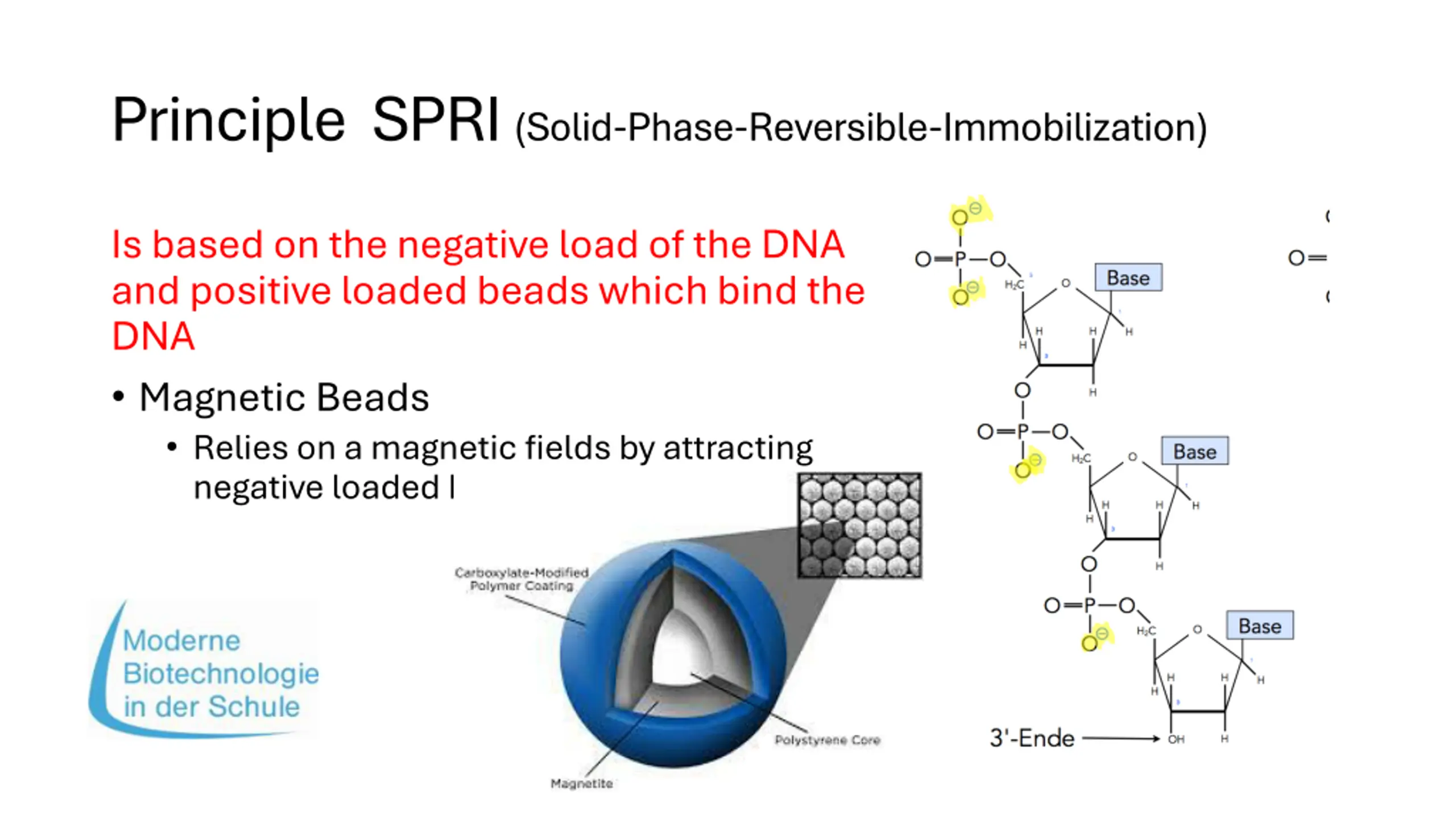 Principle SPRI (Solid-Phase-Reversible-Immobilization) Is based on the negative load of the DNA and positive loaded beads which bind the DNA Magnetic Beads Relies on a magnetic fields by attracting negative loaded DNA