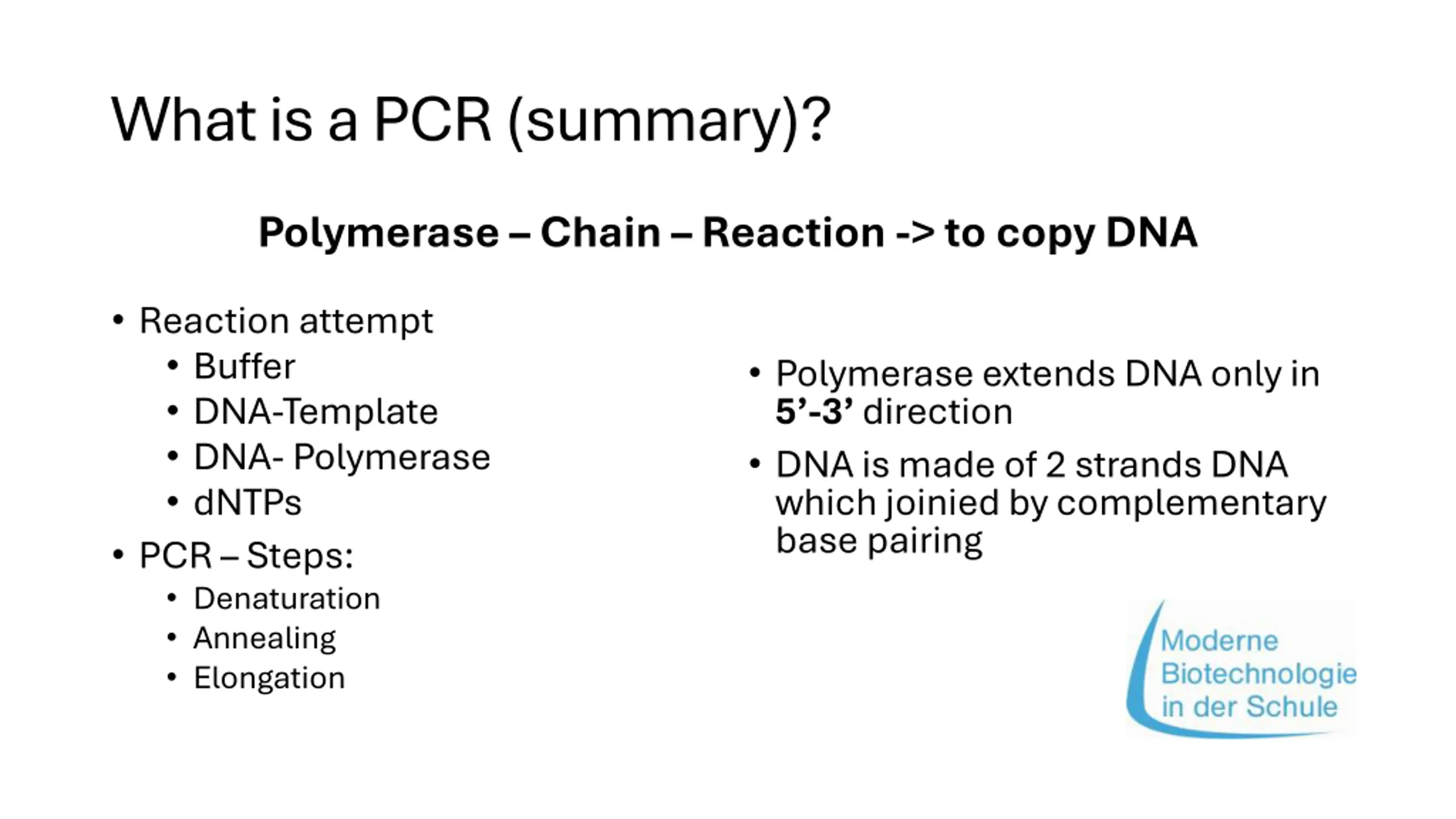 What is a PCR (summary)? Polymerase Chain Reaction -> to copy DNA Reaction attempt Buffer DNA-Template DNA- Polymerase dNTPs PCR Steps: Denaturation Annealing Elongation Polymerase extends DNA only in 5 -3 direction DNA is made of 2 strands DNA which joinied by complementary base pairing