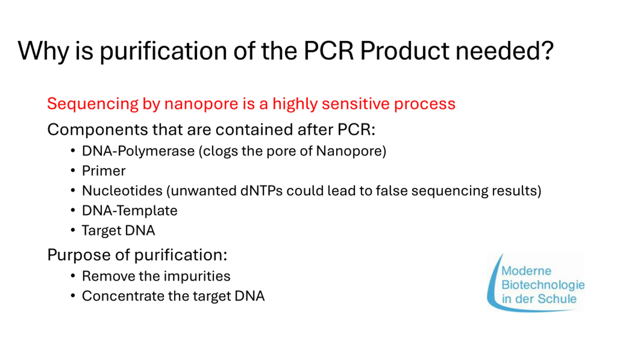Why is purification of the PCR Product needed? Sequencing by nanopore is a highly sensitive process Components that are contained after PCR: DNA-Polymerase (clogs the pore of Nanopore) Primer Nucleotides (unwanted dNTPs could lead to false sequencing results) DNA-Template Target DNA Purpose of purification: Remove the impurities Concentrate the target DNA
