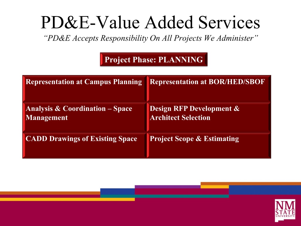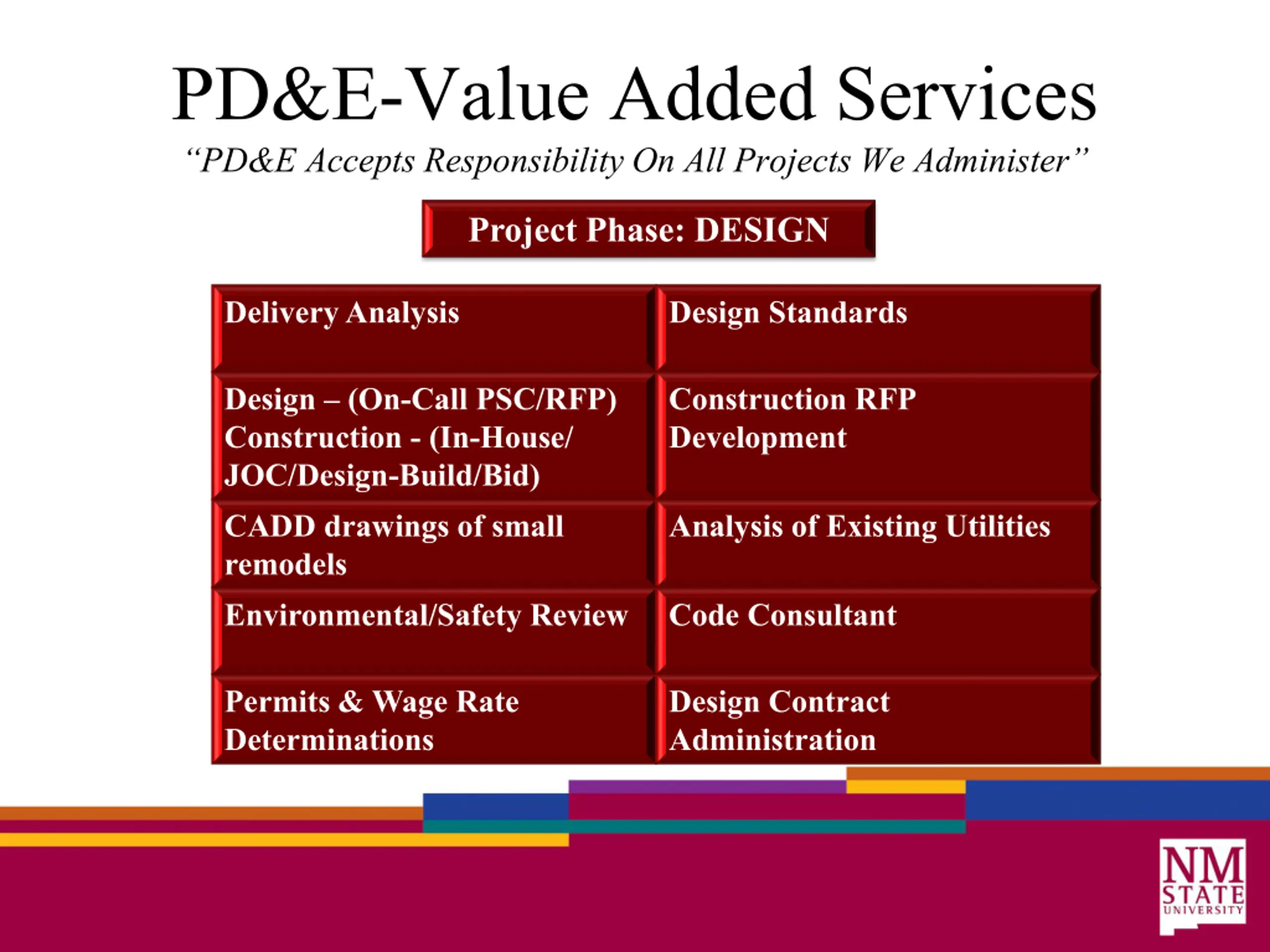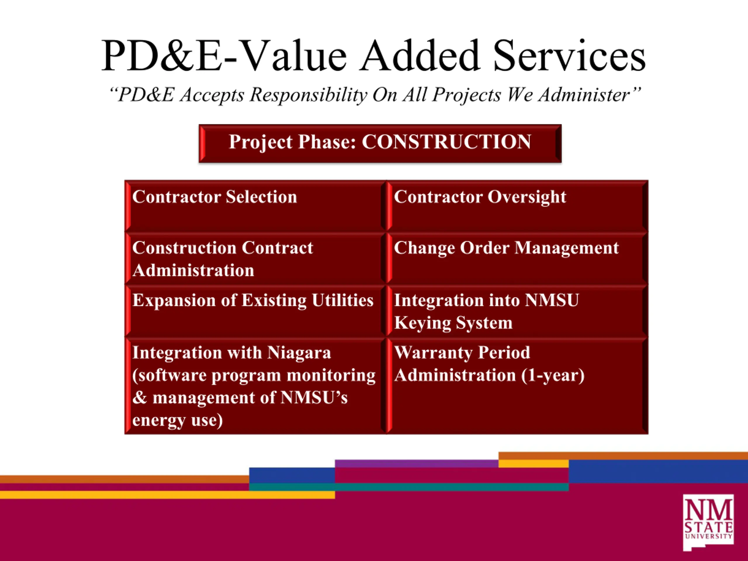 PD&E-Value Added Services PD&E Accepts Responsibility On All Projects We Administer Project Phase: CONSTRUCTION Contractor Selection Contractor Oversight Construction Contract Administration Expansion of Existing Utilities Change Order Management Integration into NMSU Keying System Warranty Period Administration (1-year) Integration with Niagara (software program monitoring & management of NMSU s energy use)