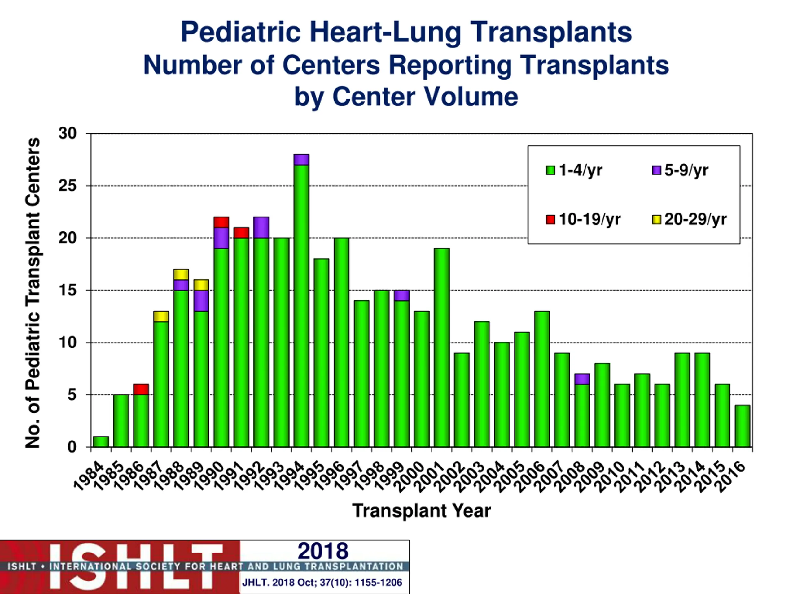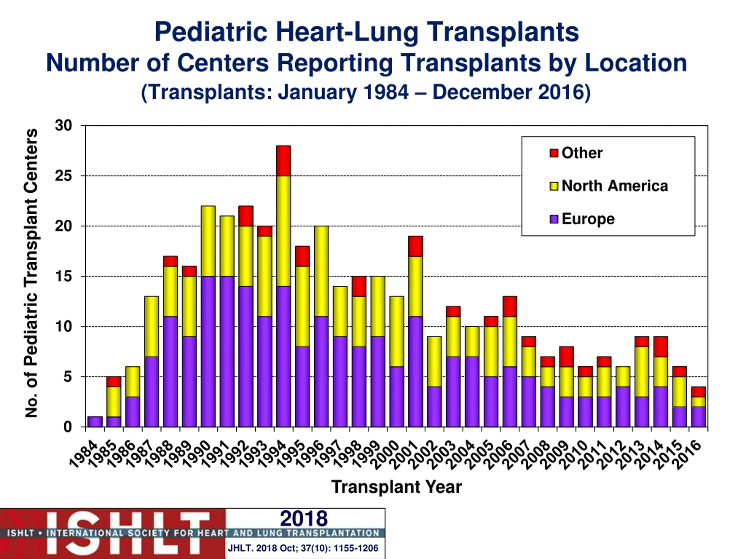 Pediatric Heart-Lung Transplants Number of Centers Reporting Transplants by Location (Transplants: January 1984 December 2016) 30 No. of Pediatric Transplant Centers Other 25 North America Europe 20 15 10 5 0 Transplant Year 2018 JHLT. 2018 Oct; 37(10): 1155-1206
