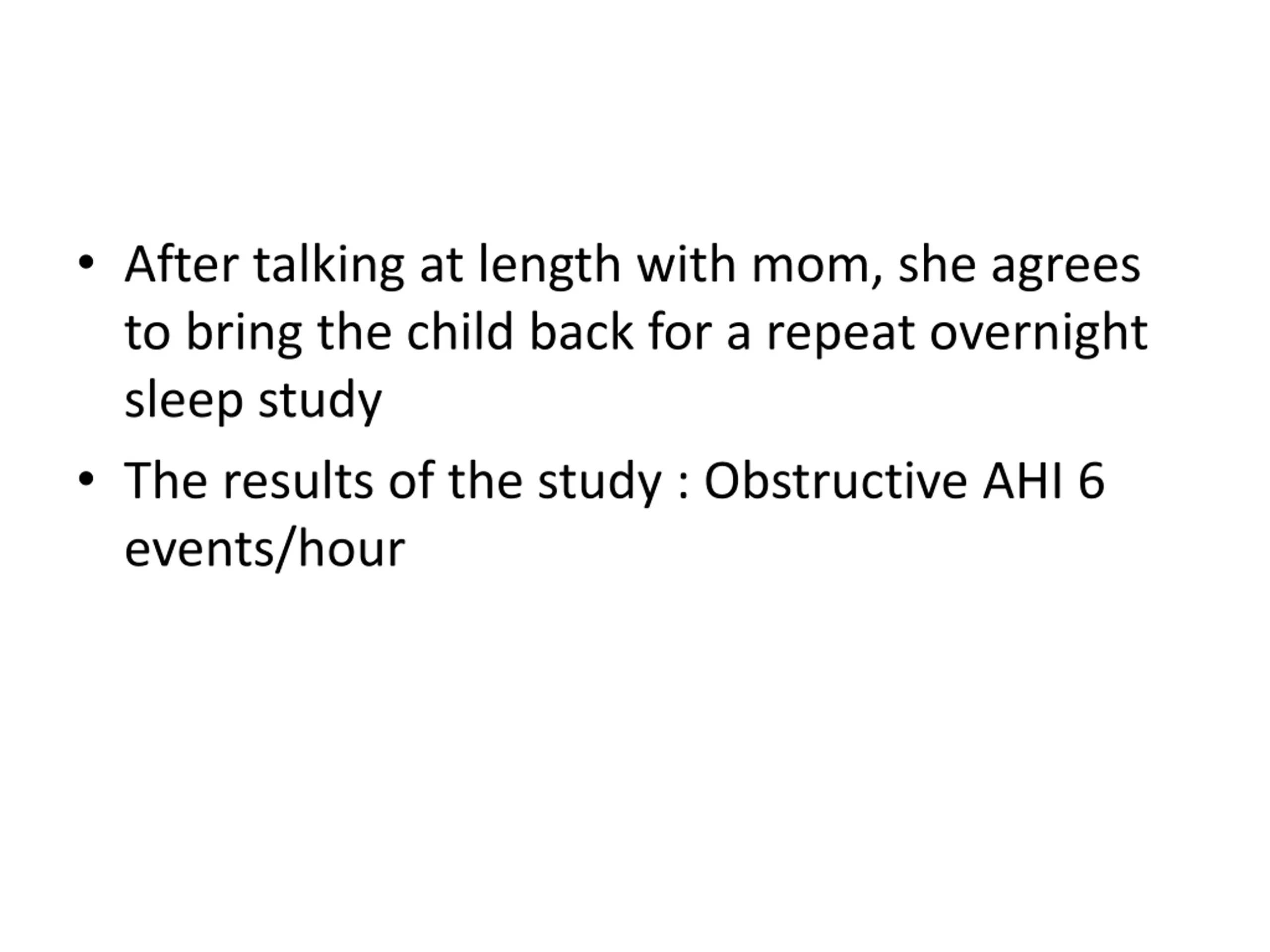 After talking at length with mom, she agrees to bring the child back for a repeat overnight sleep study The results of the study : Obstructive AHI 6 events/hour