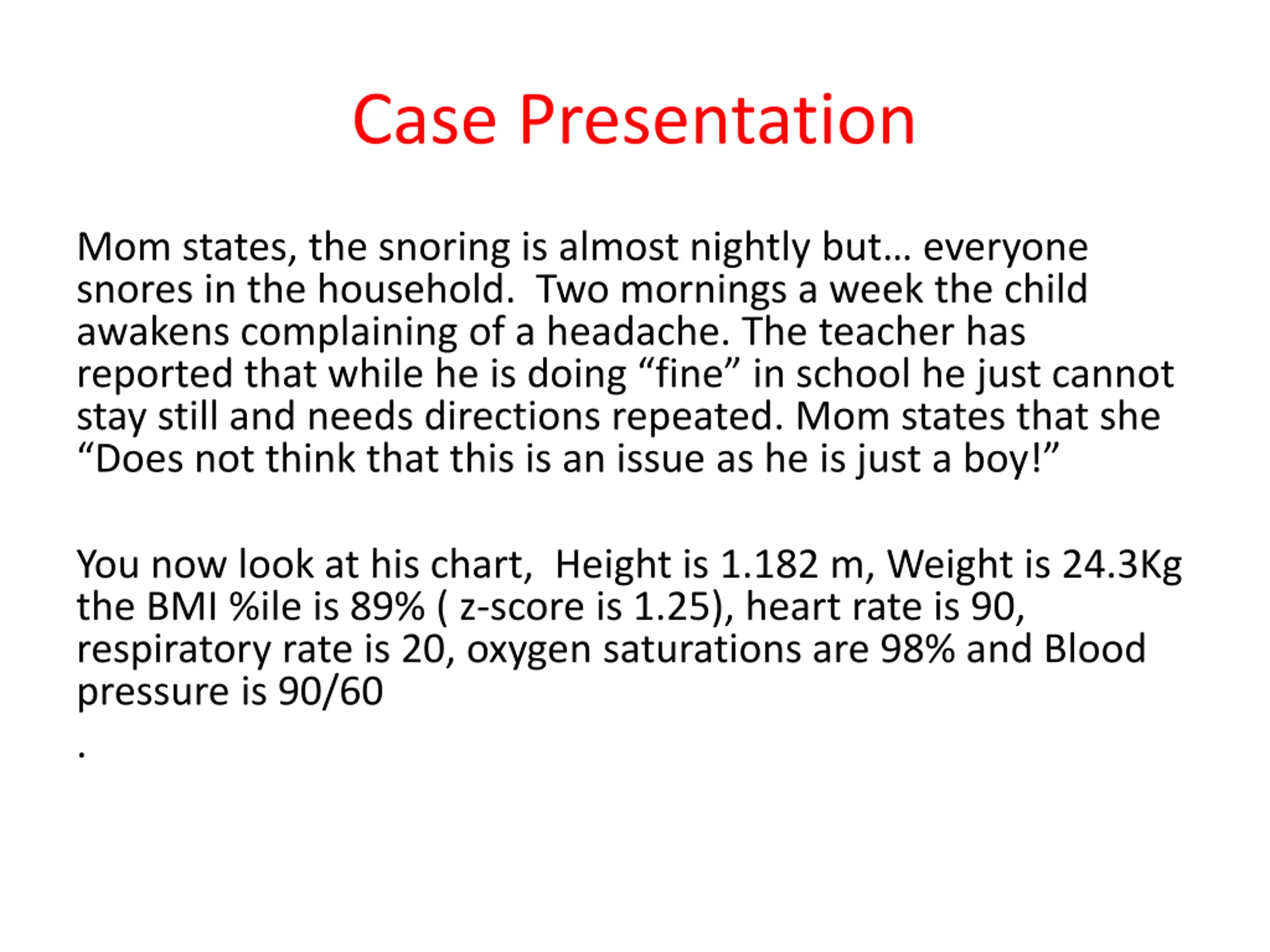 Case Presentation Mom states, the snoring is almost nightly but everyone snores in the household. Two mornings a week the child awakens complaining of a headache. The teacher has reported that while he is doing fine in school he just cannot stay still and needs directions repeated. Mom states that she Does not think that this is an issue as he is just a boy! You now look at his chart, Height is 1.182 m, Weight is 24.3Kg the BMI %ile is 89% ( z-score is 1.25), heart rate is 90, respiratory rate is 20, oxygen saturations are 98% and Blood pressure is 90/60 .