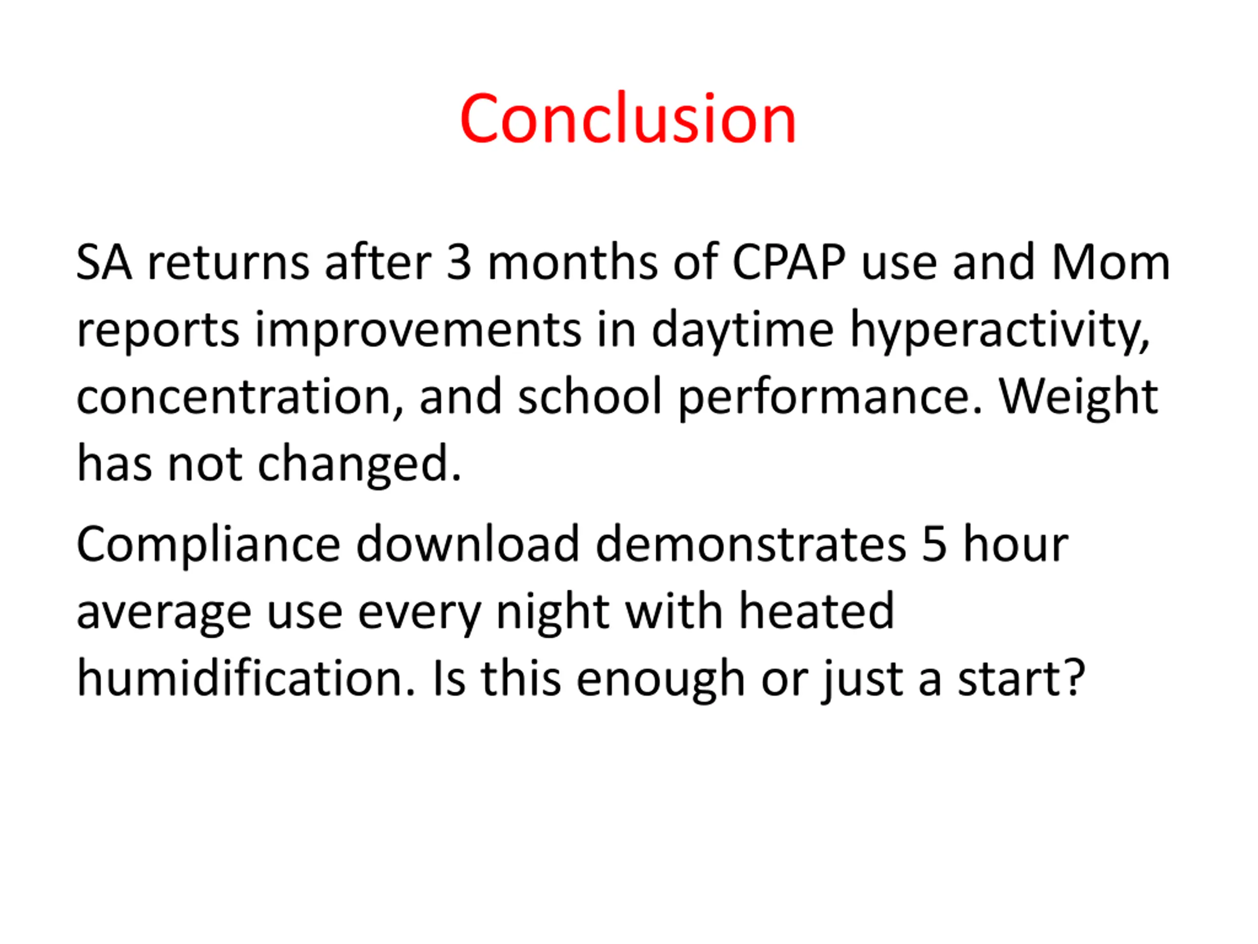 Conclusion SA returns after 3 months of CPAP use and Mom reports improvements in daytime hyperactivity, concentration, and school performance. Weight has not changed. Compliance download demonstrates 5 hour average use every night with heated humidification. Is this enough or just a start?