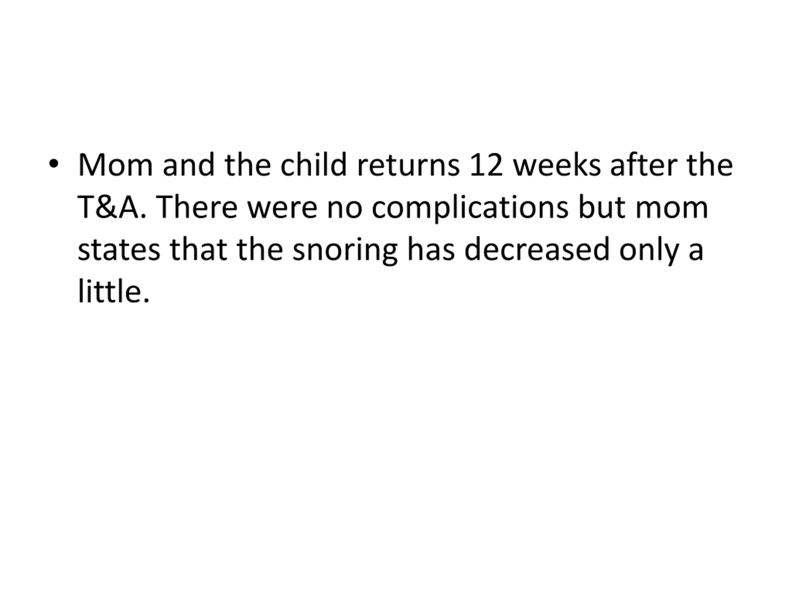 Mom and the child returns 12 weeks after the T&A. There were no complications but mom states that the snoring has decreased only a little.