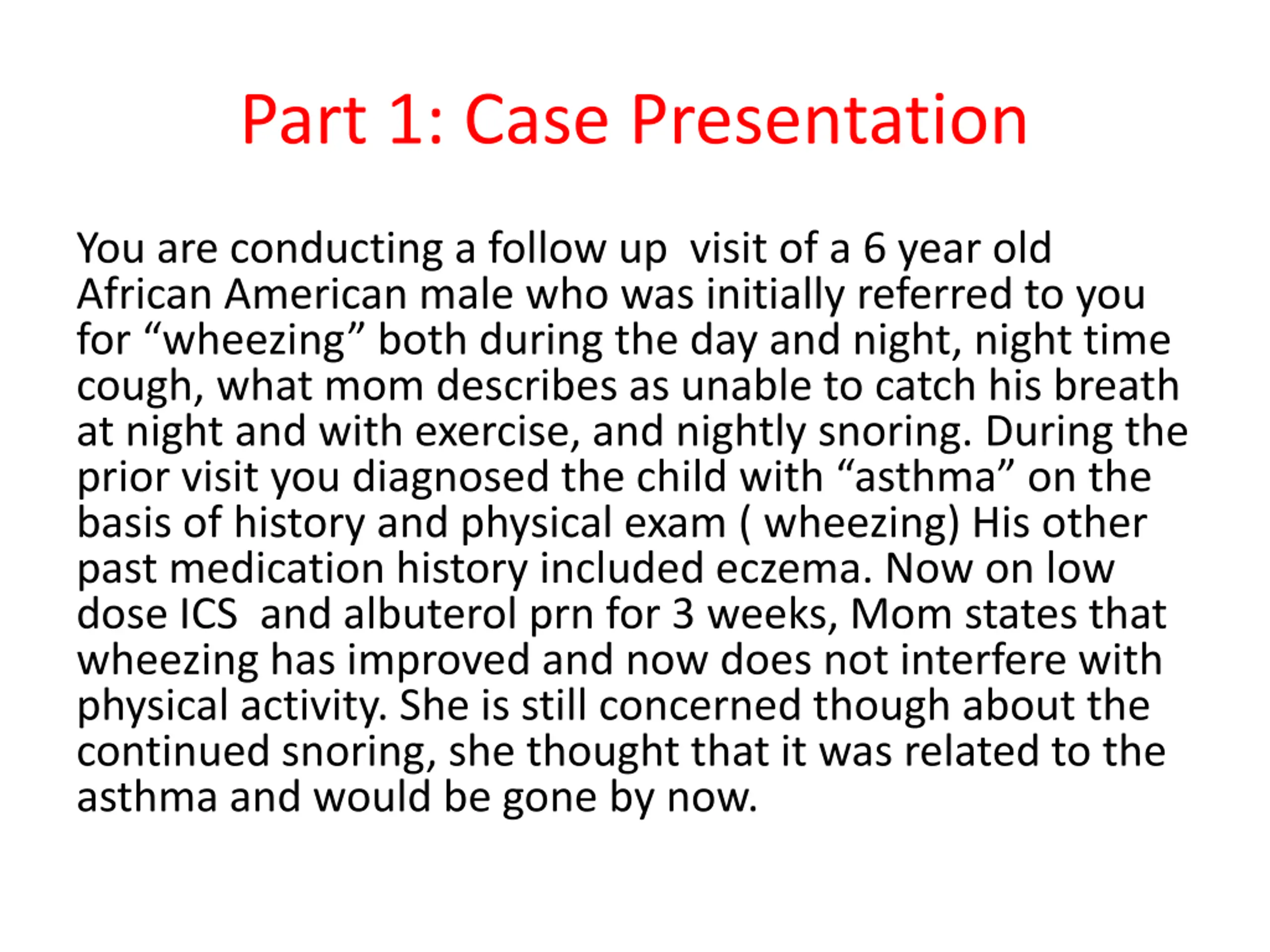 Part 1: Case Presentation You are conducting a follow up visit of a 6 year old African American male who was initially referred to you for wheezing both during the day and night, night time cough, what mom describes as unable to catch his breath at night and with exercise, and nightly snoring. During the prior visit you diagnosed the child with asthma on the basis of history and physical exam ( wheezing) His other past medication history included eczema. Now on low dose ICS and albuterol prn for 3 weeks, Mom states that wheezing has improved and now does not interfere with physical activity. She is still concerned though about the continued snoring, she thought that it was related to the asthma and would be gone by now.