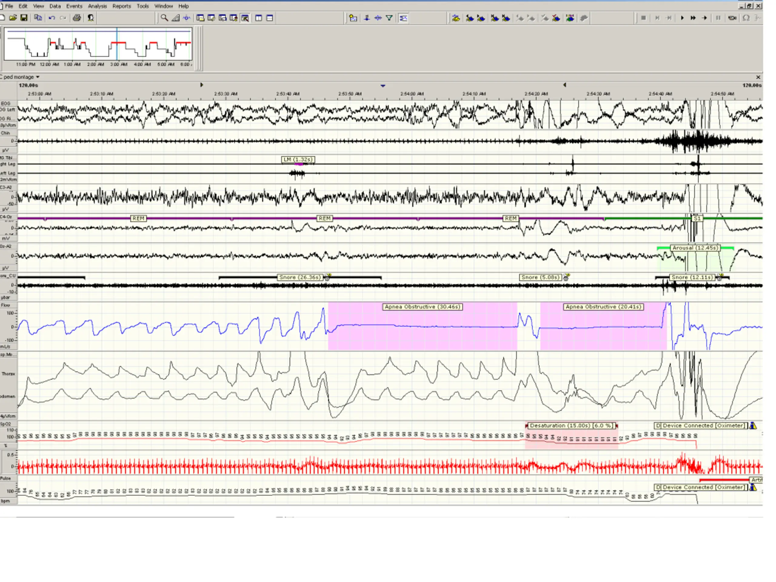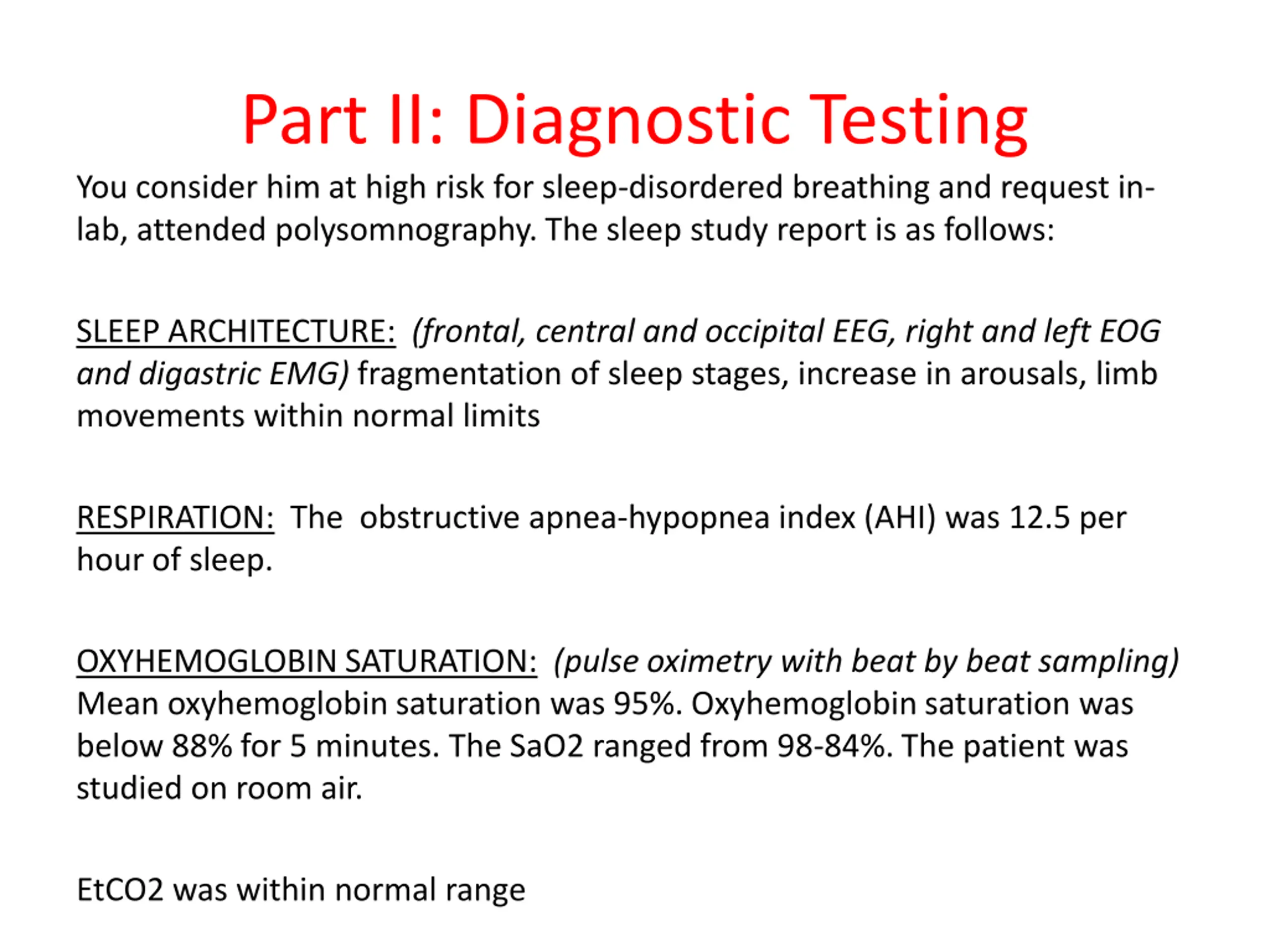 Part II: Diagnostic Testing You consider him at high risk for sleep-disordered breathing and request in- lab, attended polysomnography. The sleep study report is as follows: SLEEP ARCHITECTURE: (frontal, central and occipital EEG, right and left EOG and digastric EMG) fragmentation of sleep stages, increase in arousals, limb movements within normal limits RESPIRATION: The obstructive apnea-hypopnea index (AHI) was 12.5 per hour of sleep. OXYHEMOGLOBIN SATURATION: (pulse oximetry with beat by beat sampling) Mean oxyhemoglobin saturation was 95%. Oxyhemoglobin saturation was below 88% for 5 minutes. The SaO2 ranged from 98-84%. The patient was studied on room air. EtCO2 was within normal range