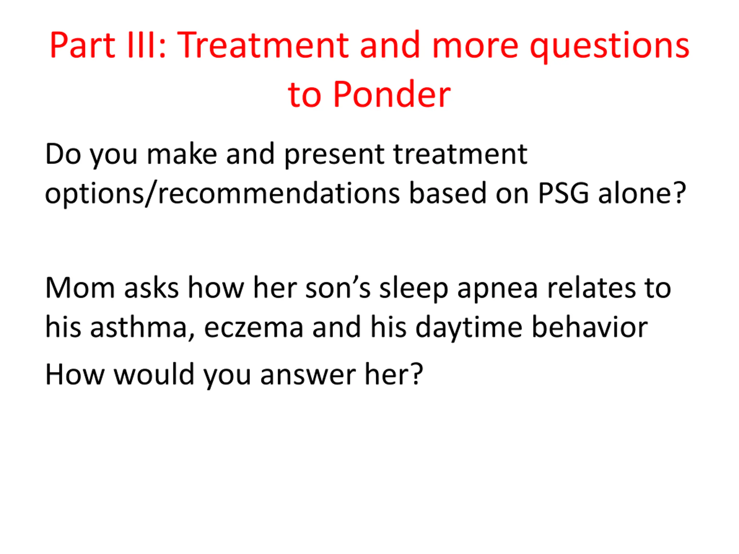 Part III: Treatment and more questions to Ponder Do you make and present treatment options/recommendations based on PSG alone? Mom asks how her son s sleep apnea relates to his asthma, eczema and his daytime behavior How would you answer her?