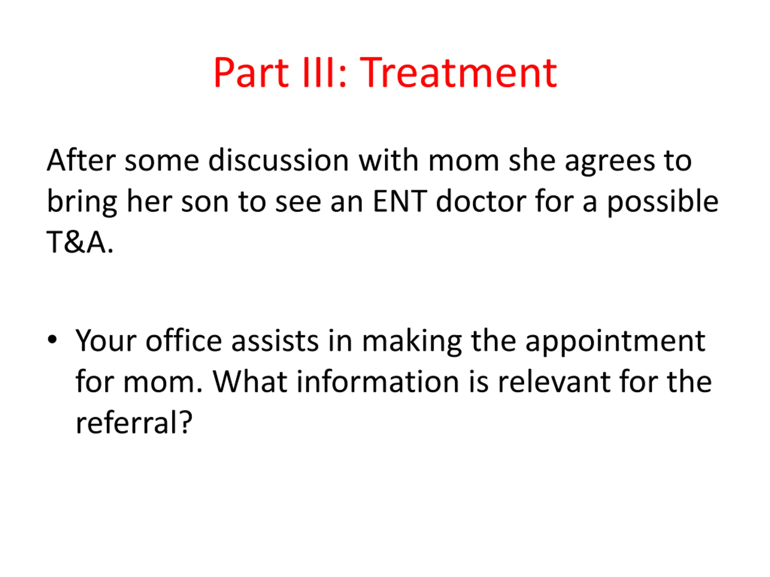 Part III: Treatment After some discussion with mom she agrees to bring her son to see an ENT doctor for a possible T&A. Your office assists in making the appointment for mom. What information is relevant for the referral?