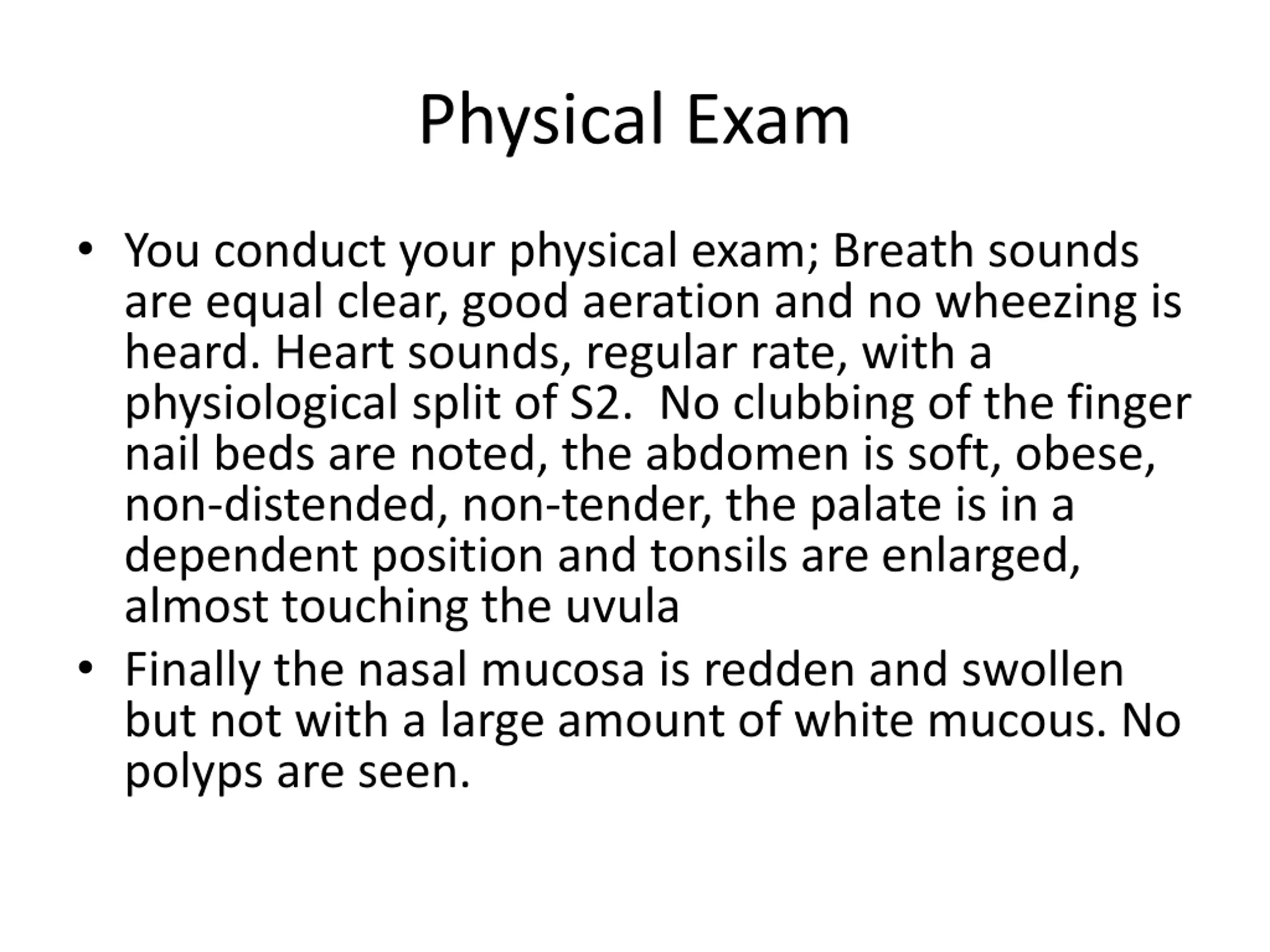 Physical Exam You conduct your physical exam; Breath sounds are equal clear, good aeration and no wheezing is heard. Heart sounds, regular rate, with a physiological split of S2. No clubbing of the finger nail beds are noted, the abdomen is soft, obese, non-distended, non-tender, the palate is in a dependent position and tonsils are enlarged, almost touching the uvula Finally the nasal mucosa is redden and swollen but not with a large amount of white mucous. No polyps are seen.