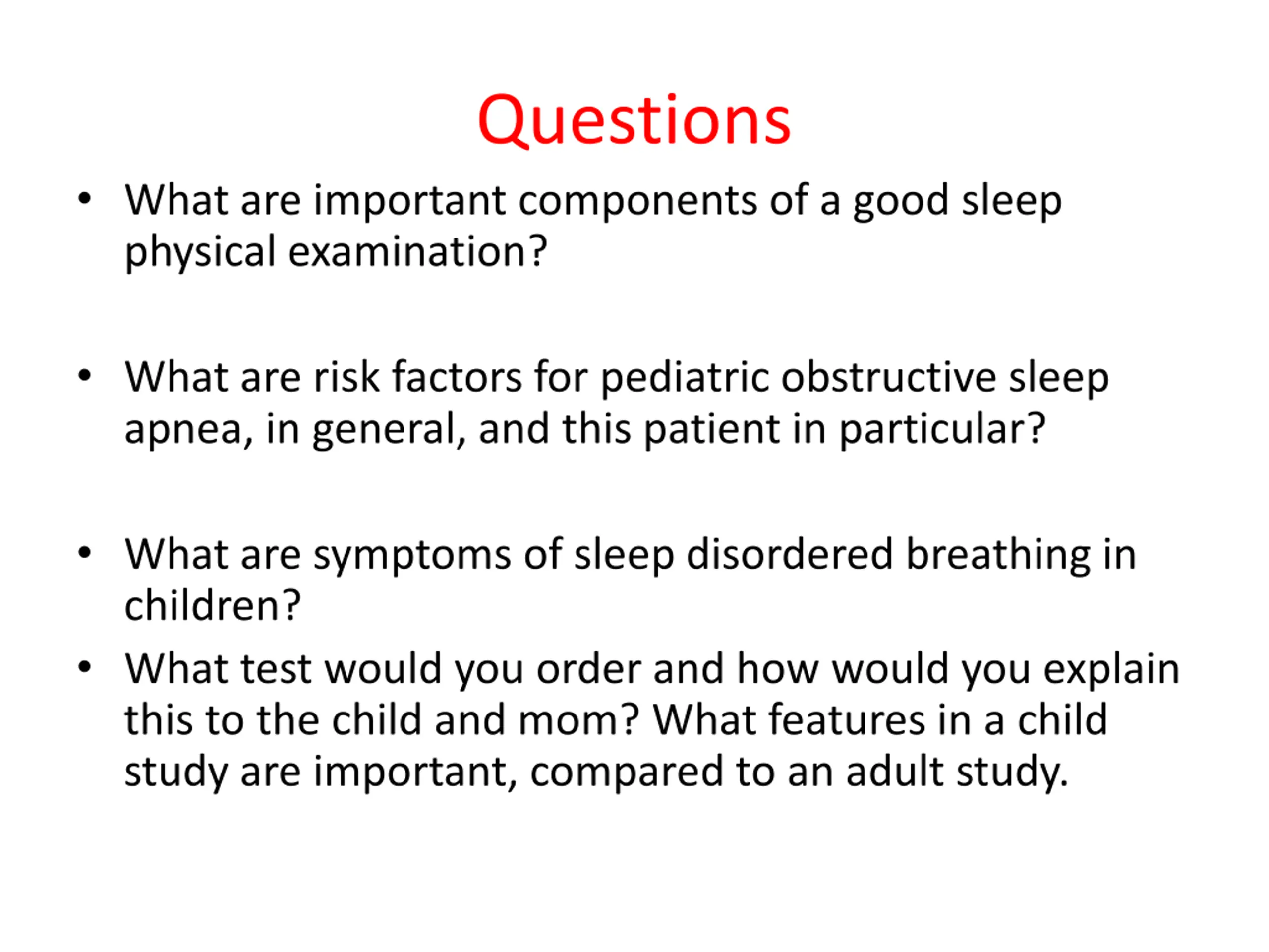 Questions What are important components of a good sleep physical examination? What are risk factors for pediatric obstructive sleep apnea, in general, and this patient in particular? What are symptoms of sleep disordered breathing in children? What test would you order and how would you explain this to the child and mom? What features in a child study are important, compared to an adult study.