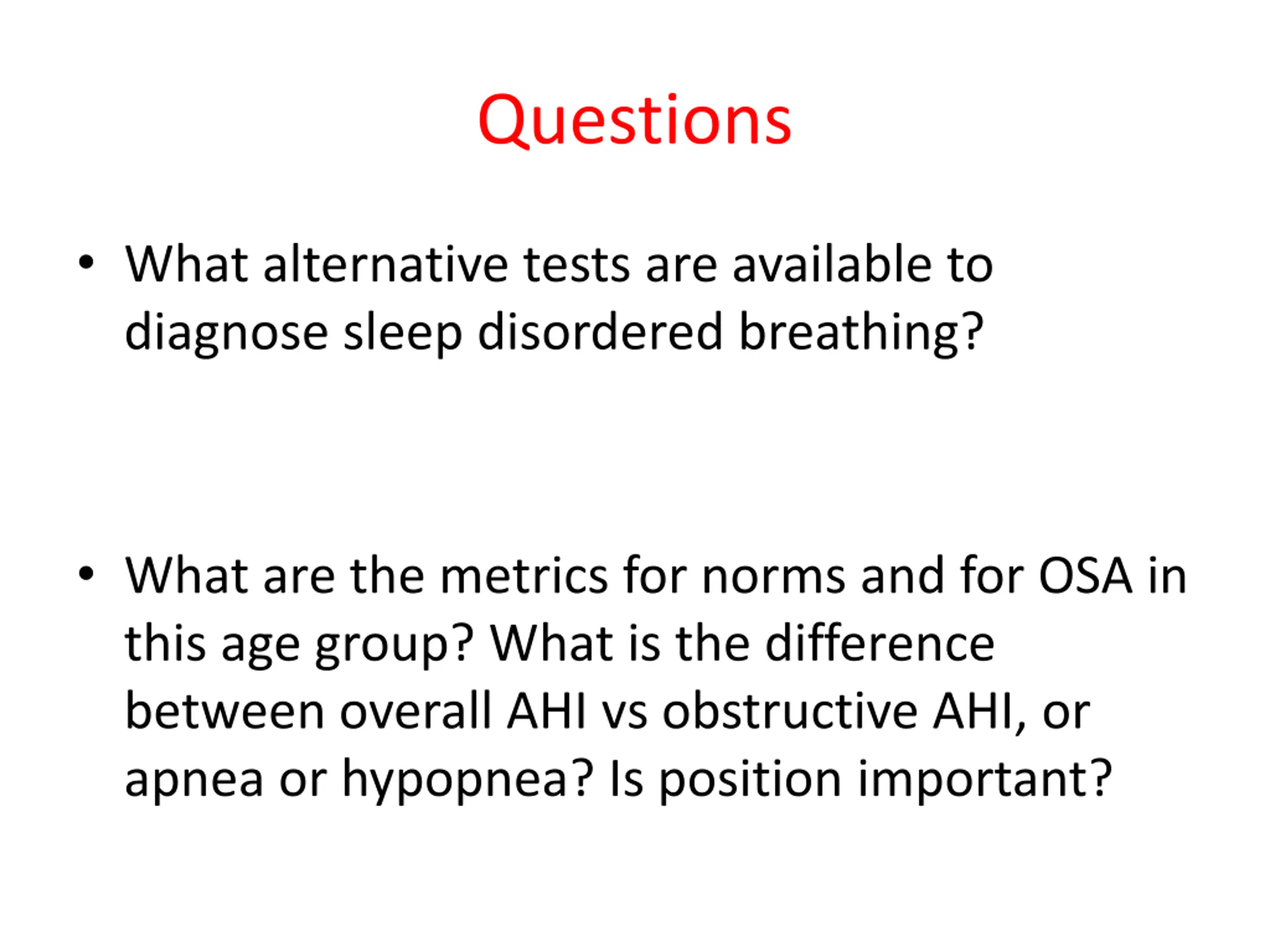 Questions What alternative tests are available to diagnose sleep disordered breathing? What are the metrics for norms and for OSA in this age group? What is the difference between overall AHI vs obstructive AHI, or apnea or hypopnea? Is position important?