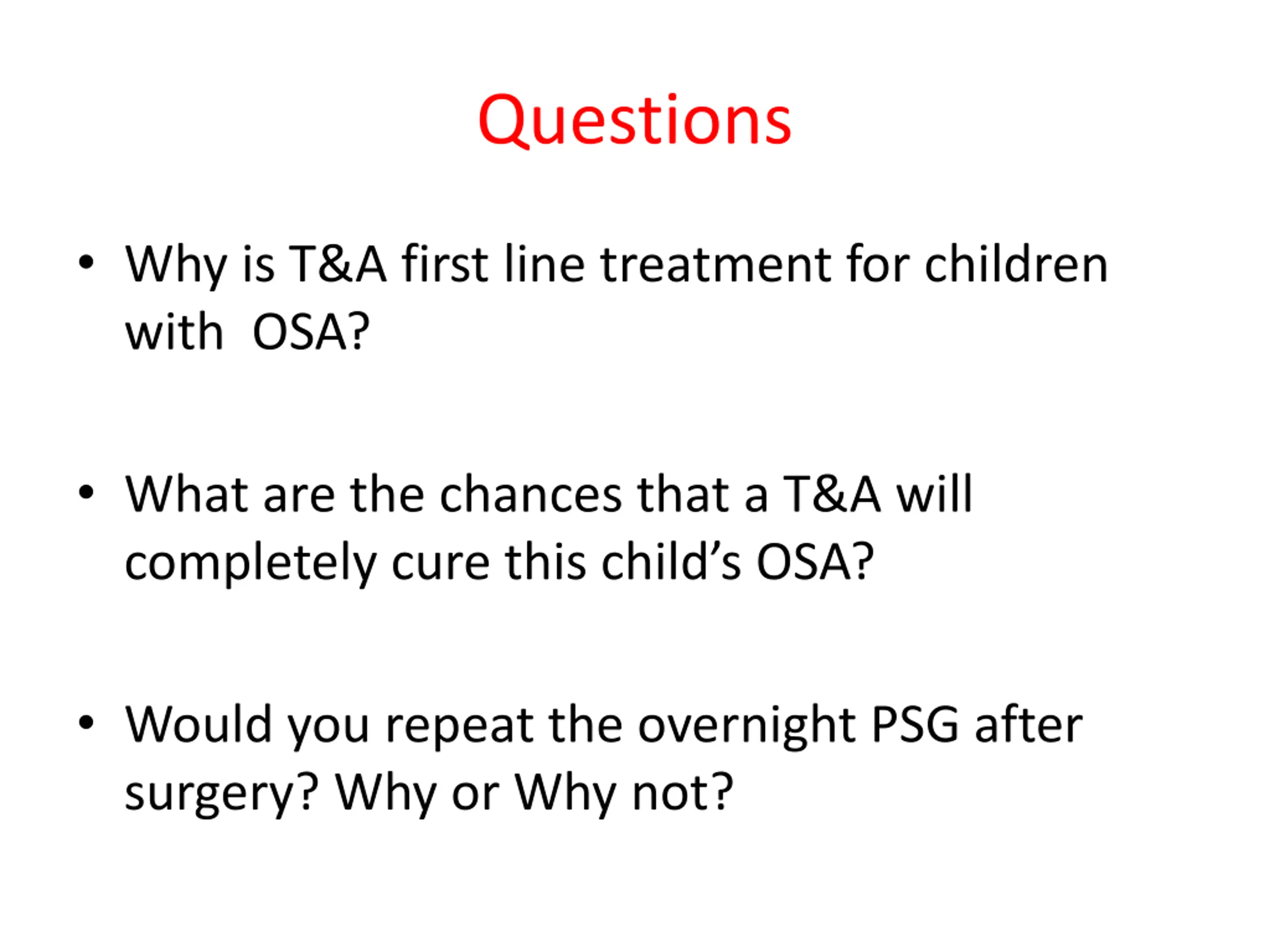 Questions Why is T&A first line treatment for children with OSA? What are the chances that a T&A will completely cure this child s OSA? Would you repeat the overnight PSG after surgery? Why or Why not?