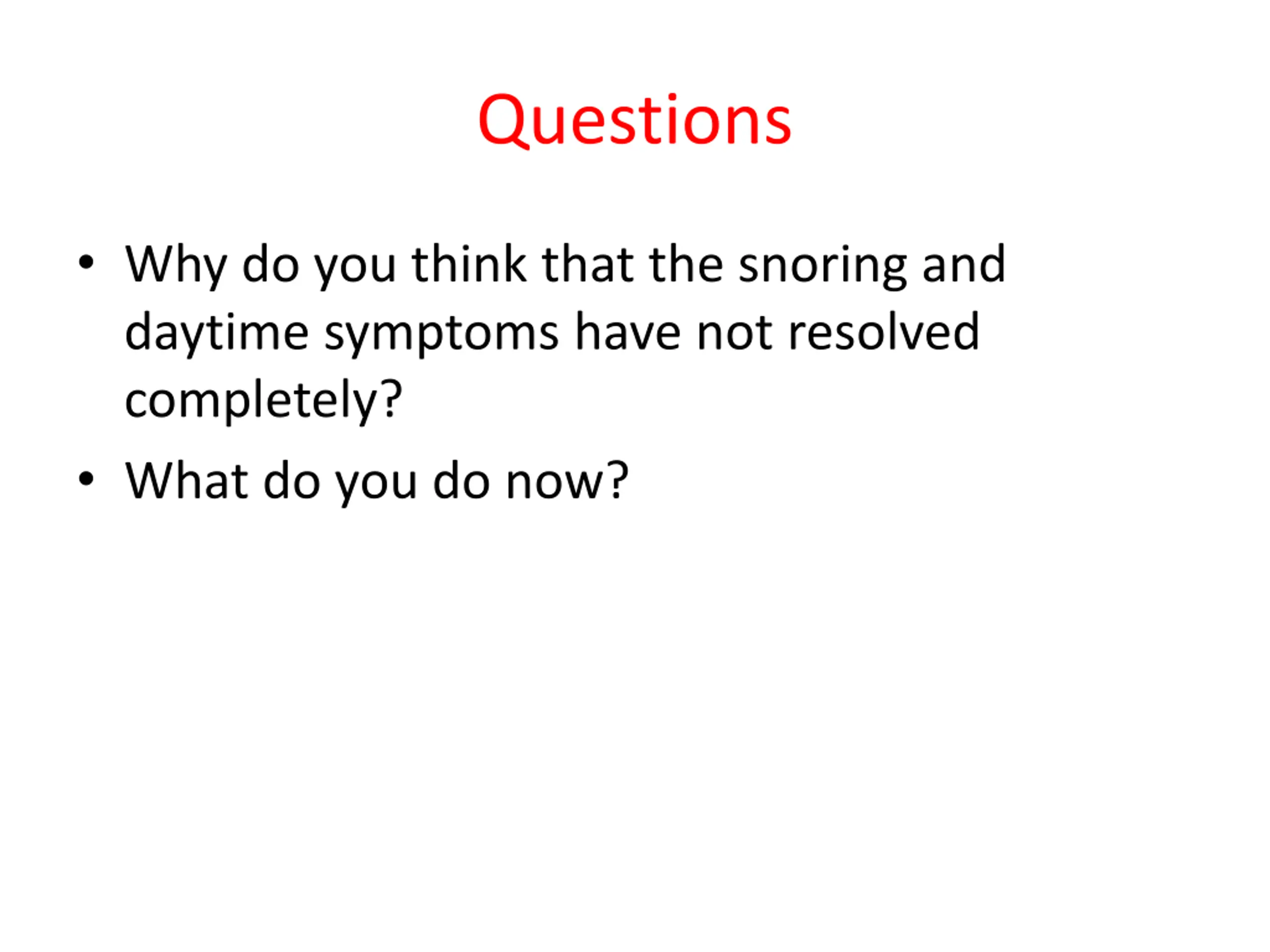 Questions Why do you think that the snoring and daytime symptoms have not resolved completely? What do you do now?