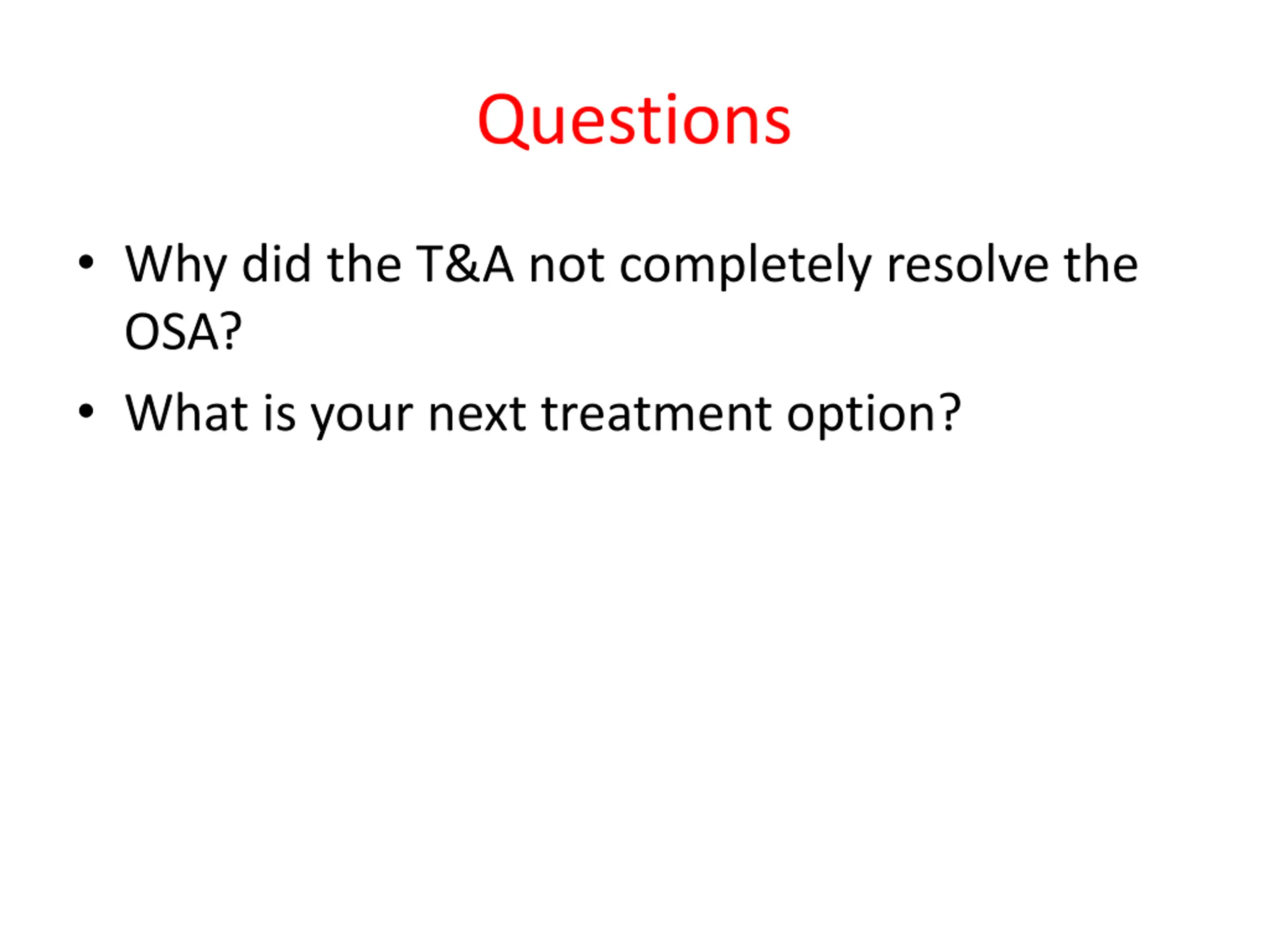 Questions Why did the T&A not completely resolve the OSA? What is your next treatment option?