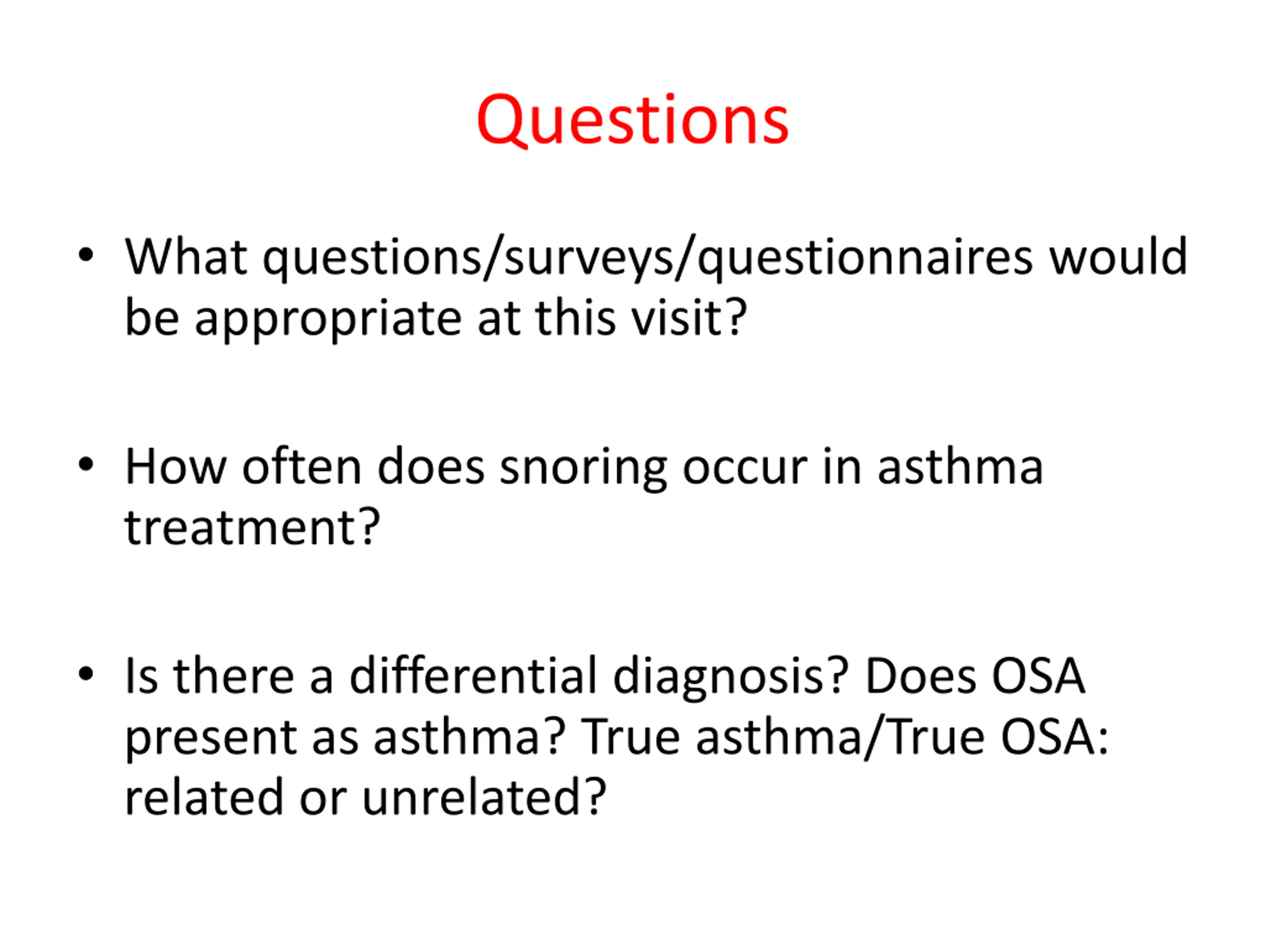 Questions What questions/surveys/questionnaires would be appropriate at this visit? How often does snoring occur in asthma treatment? Is there a differential diagnosis? Does OSA present as asthma? True asthma/True OSA: related or unrelated?