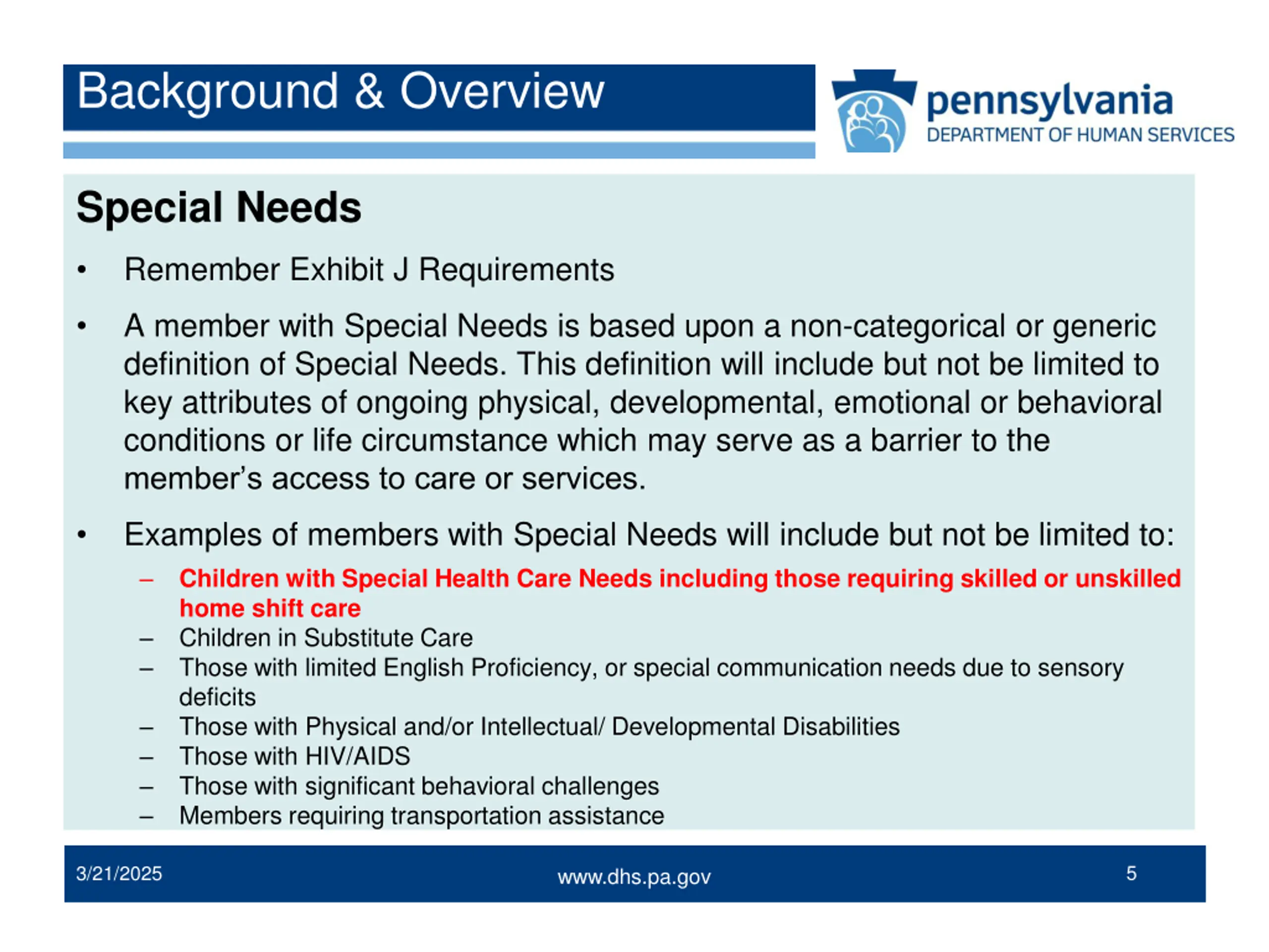 Background & Overview Special Needs Remember Exhibit J Requirements A member with Special Needs is based upon a non-categorical or generic definition of Special Needs. This definition will include but not be limited to key attributes of ongoing physical, developmental, emotional or behavioral conditions or life circumstance which may serve as a barrier to the member s access to care or services. Examples of members with Special Needs will include but not be limited to: Children with Special Health Care Needs including those requiring skilled or unskilled home shift care Children in Substitute Care Those with limited English Proficiency, or special communication needs due to sensory deficits Those with Physical and/or Intellectual/ Developmental Disabilities Those with HIV/AIDS Those with significant behavioral challenges Members requiring transportation assistance www.dpw.state.pa.us > > 5 3/21/2025 www.dhs.pa.gov