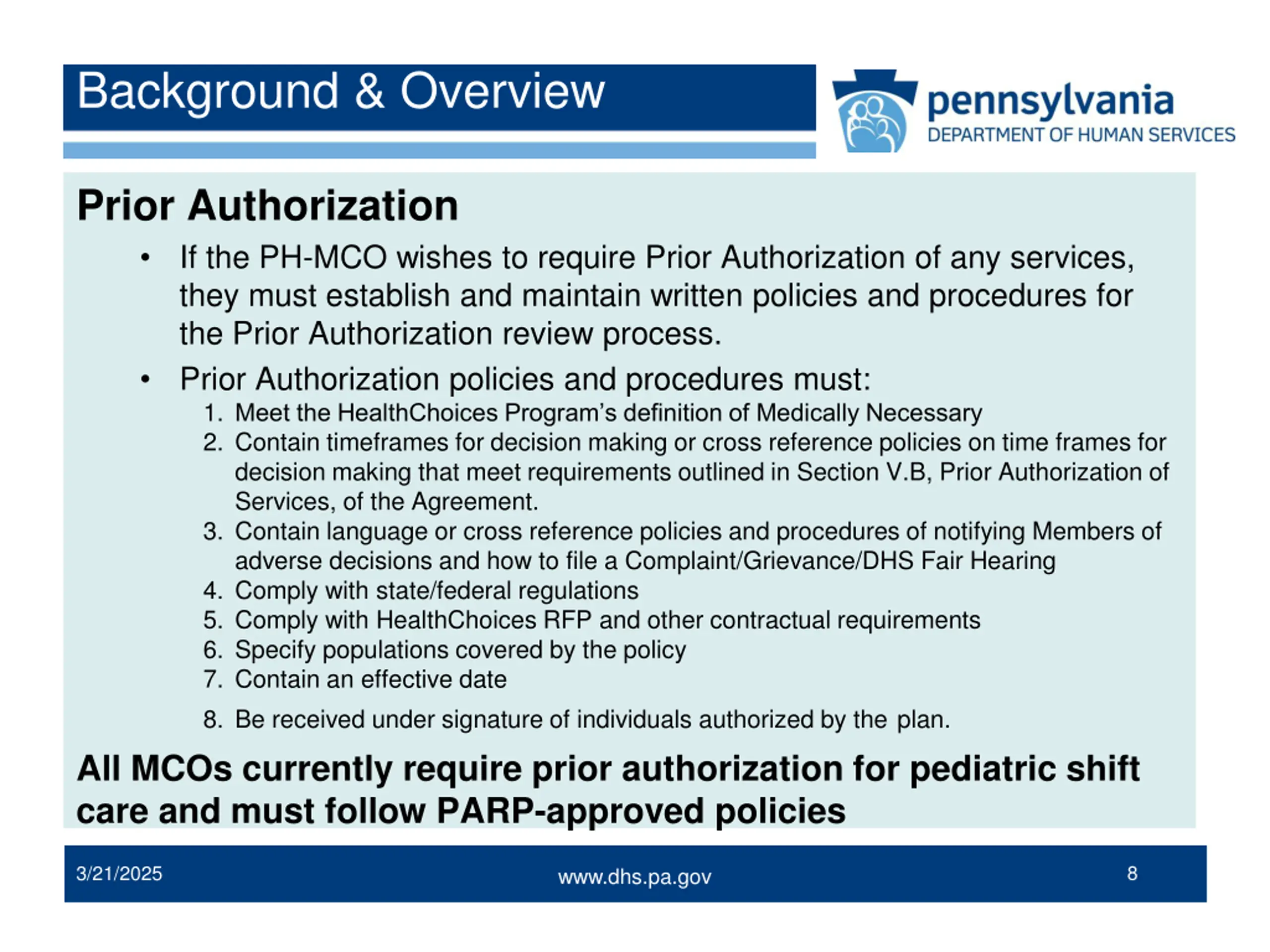 Background & Overview Prior Authorization If the PH-MCO wishes to require Prior Authorization of any services, they must establish and maintain written policies and procedures for the Prior Authorization review process. Prior Authorization policies and procedures must: 1. Meet the HealthChoices Program s definition of Medically Necessary 2. Contain timeframes for decision making or cross reference policies on time frames for decision making that meet requirements outlined in Section V.B, Prior Authorization of Services, of the Agreement. 3. Contain language or cross reference policies and procedures of notifying Members of adverse decisions and how to file a Complaint/Grievance/DHS Fair Hearing 4. Comply with state/federal regulations 5. Comply with HealthChoices RFP and other contractual requirements 6. Specify populations covered by the policy 7. Contain an effective date 8. Be received under signature of individuals authorized by theplan. All MCOs currently require prior authorization for pediatric shift care and must follow PARP-approved policies www.dpw.state.pa.us > > 8 3/21/2025 www.dhs.pa.gov
