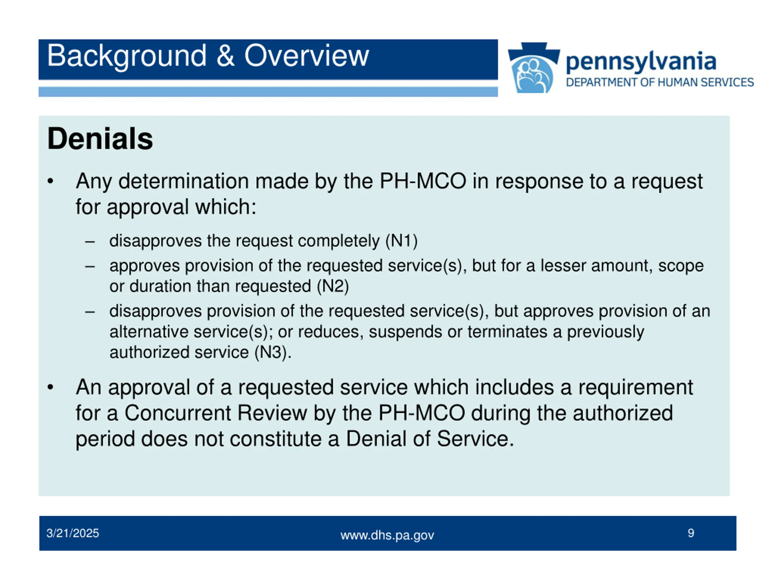 Background & Overview Denials Any determination made by the PH-MCO in response to a request for approval which: disapproves the request completely (N1) approves provision of the requested service(s), but for a lesser amount, scope or duration than requested (N2) disapproves provision of the requested service(s), but approves provision of an alternative service(s); or reduces, suspends or terminates a previously authorized service (N3). An approval of a requested service which includes a requirement for a Concurrent Review by the PH-MCO during the authorized period does not constitute a Denial of Service. www.dpw.state.pa.us > > 9 3/21/2025 www.dhs.pa.gov