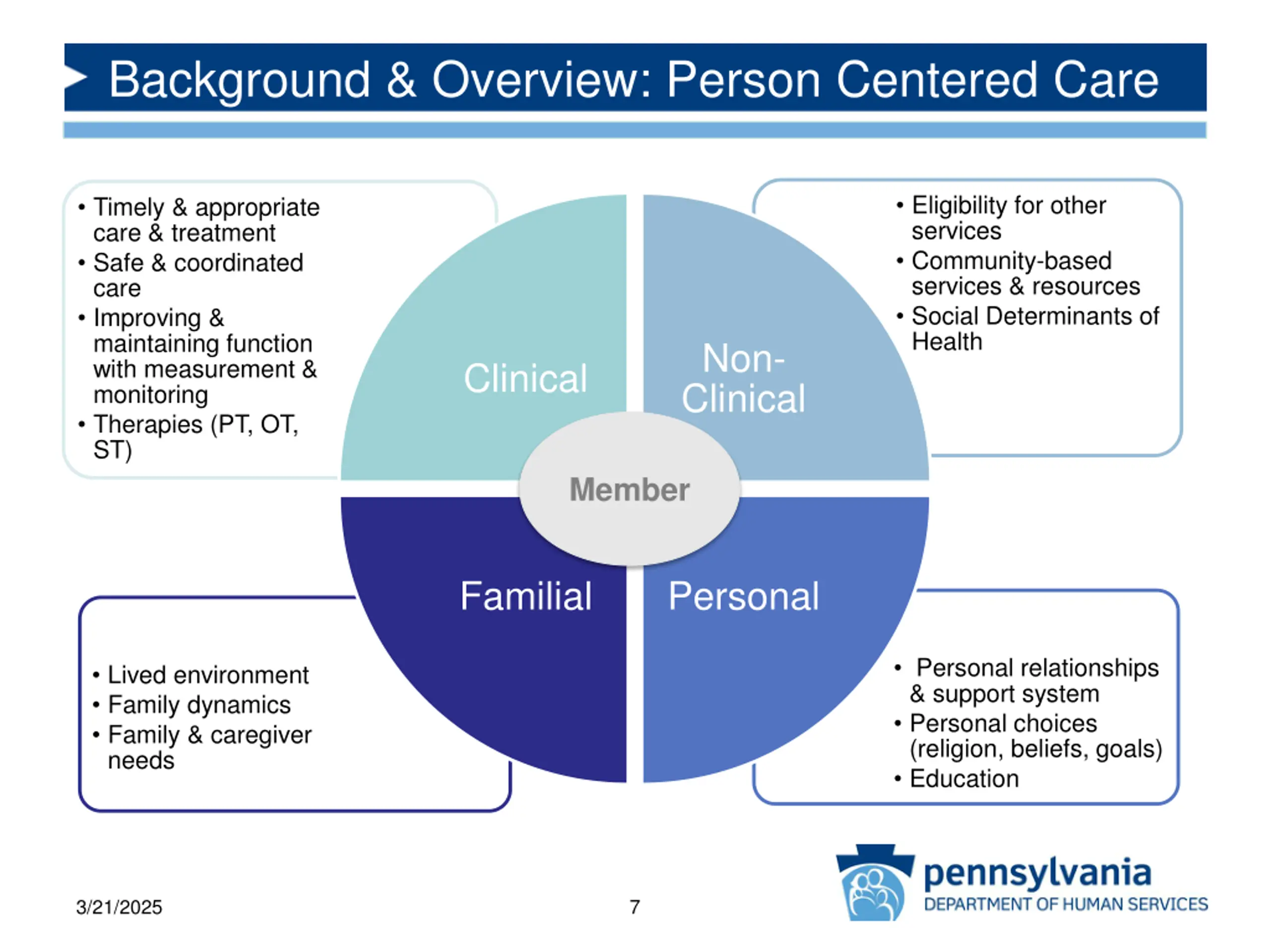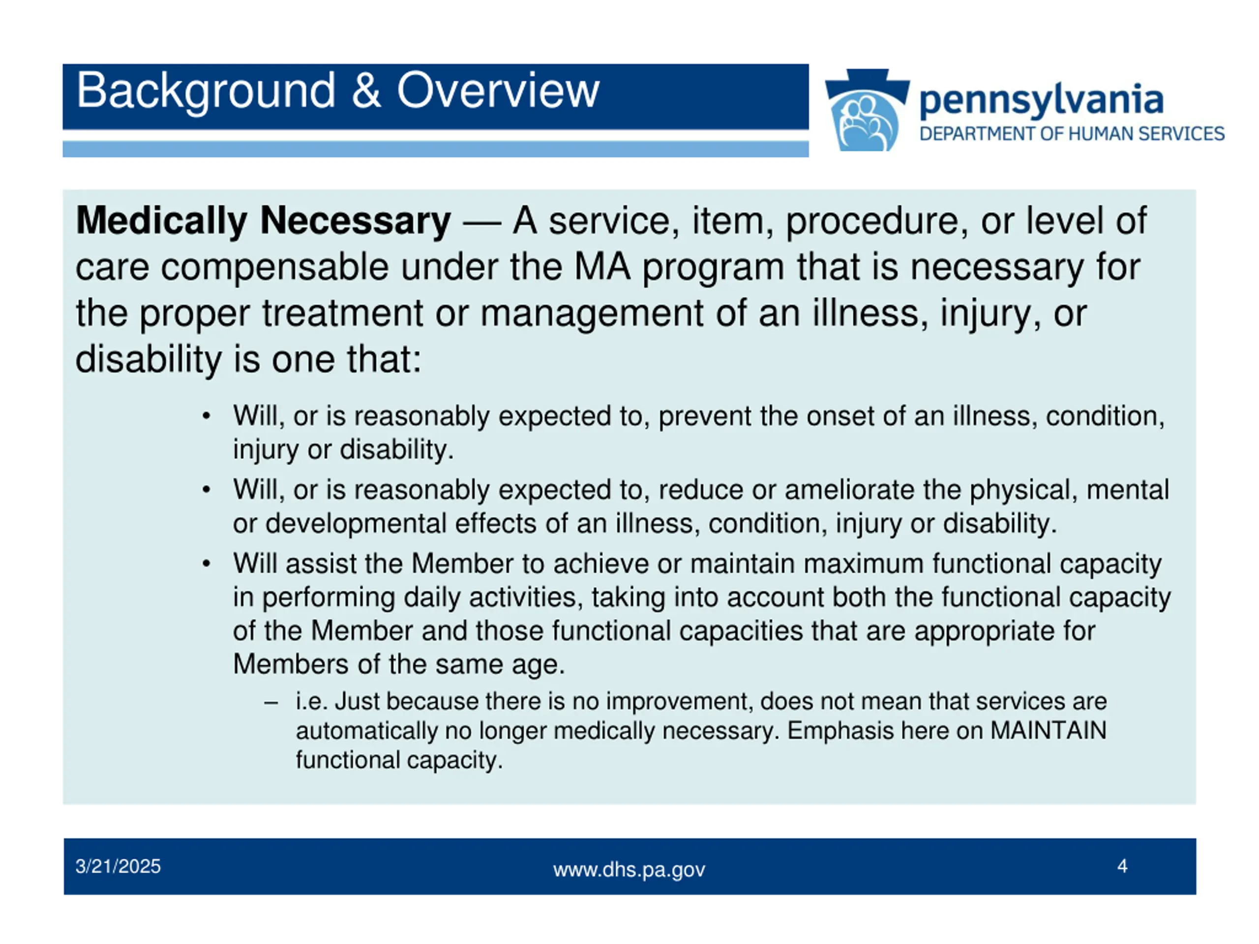 Background & Overview Medically Necessary A service, item, procedure, or level of care compensable under the MA program that is necessary for the proper treatment or management of an illness, injury, or disability is one that: Will, or is reasonably expected to, prevent the onset of an illness, condition, injury or disability. Will, or is reasonably expected to, reduce or ameliorate the physical, mental or developmental effects of an illness, condition, injury or disability. Will assist the Member to achieve or maintain maximum functional capacity in performing daily activities, taking into account both the functional capacity of the Member and those functional capacities that are appropriate for Members of the same age. i.e. Just because there is no improvement, does not mean that services are automatically no longer medically necessary. Emphasis here on MAINTAIN functional capacity. www.dpw.state.pa.us > > 4 3/21/2025 www.dhs.pa.gov
