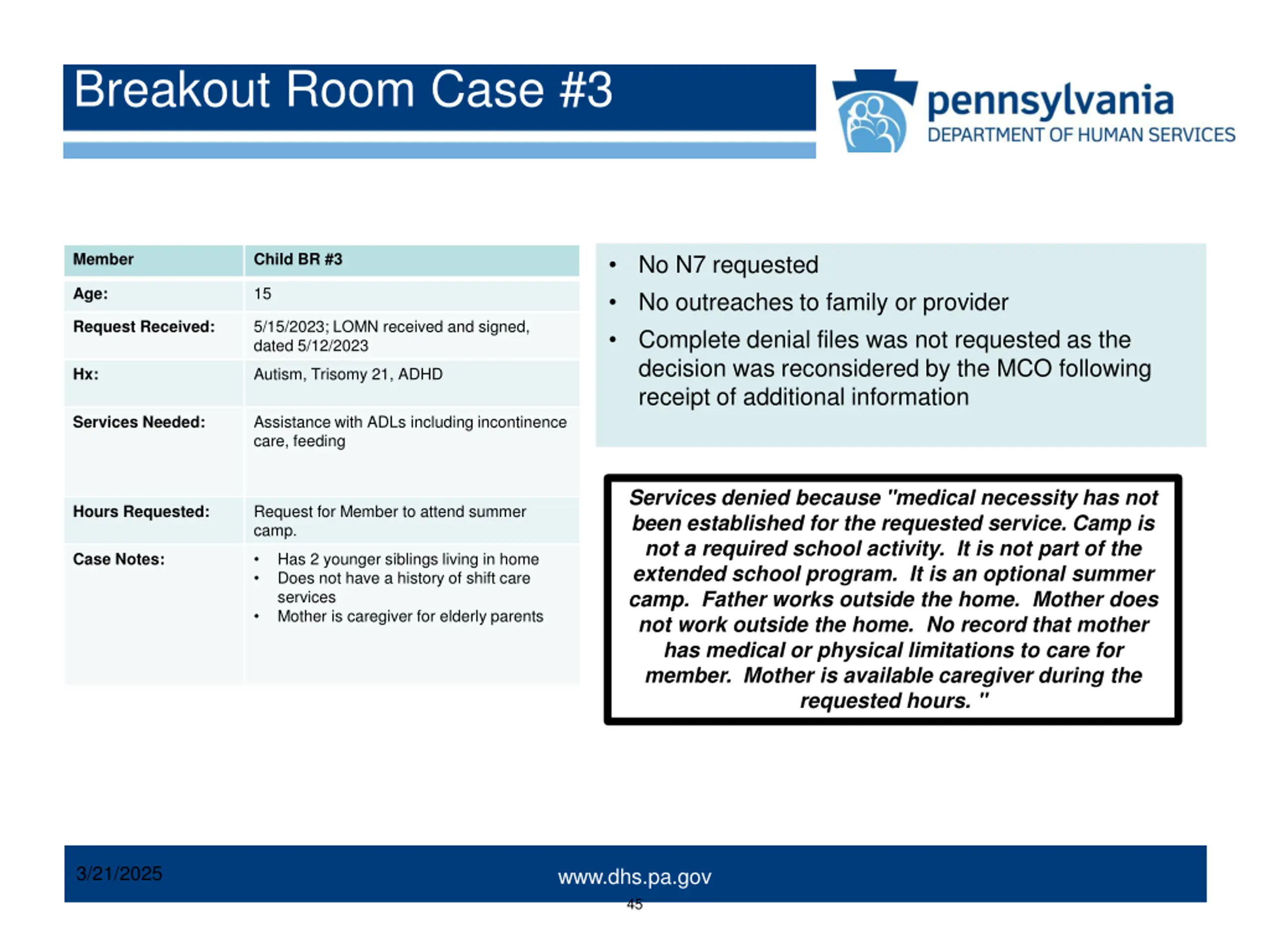 Breakout Room Case #3 Member Child BR #3 No N7 requested No outreaches to family or provider Complete denial files was not requested as the decision was reconsidered by the MCO following receipt of additional information 15 Age: 5/15/2023; LOMN received and signed, dated 5/12/2023 Request Received: Autism, Trisomy 21, ADHD Hx: Assistance with ADLs including incontinence care, feeding Services Needed: Services denied because "medical necessity has not been established for the requested service. Camp is not a required school activity. It is not part of the extended school program. It is an optional summer camp. Father works outside the home. Mother does not work outside the home. No record that mother has medical or physical limitations to care for member. Mother is available caregiver during the requested hours. " Request for Member to attend summer camp. Hours Requested: Has 2 younger siblings living in home Does not have a history of shift care services Mother is caregiver for elderly parents Case Notes: www.dpw.state.pa.us > > 3/21/2025 www.dhs.pa.gov 45