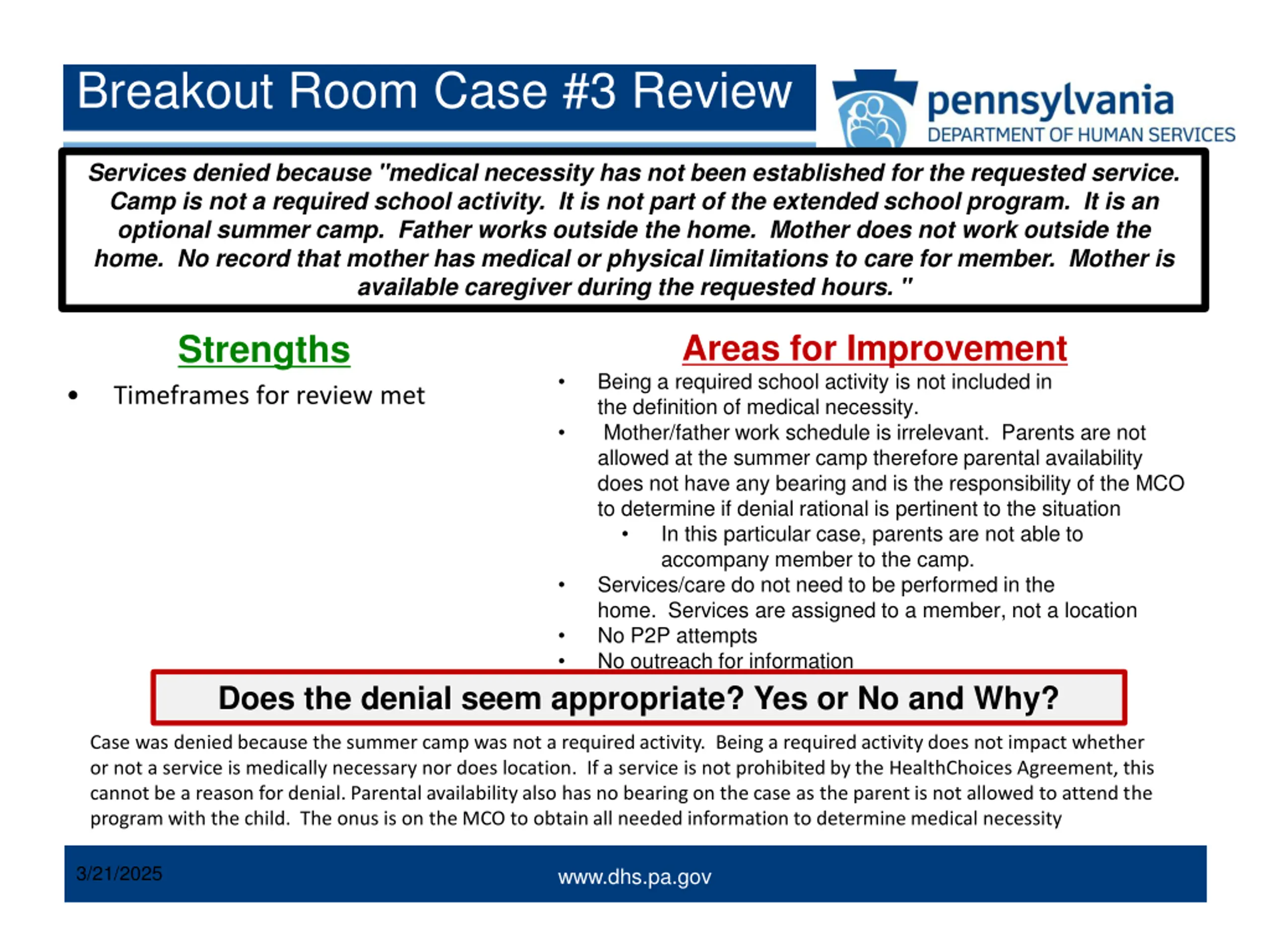 Breakout Room Case #3 Review Services denied because "medical necessity has not been established for the requested service. Camp is not a required school activity. It is not part of the extended school program. It is an optional summer camp. Father works outside the home. Mother does not work outside the home. No record that mother has medical or physical limitations to care for member. Mother is available caregiver during the requested hours. " Strengths Timeframes for review met Areas for Improvement Being a required school activity is not included in the definition of medical necessity. Mother/father work schedule is irrelevant. Parents are not allowed at the summer camp therefore parental availability does not have any bearing and is the responsibility of the MCO to determine if denial rational is pertinent to the situation In this particular case, parents are not able to accompany member to the camp. Services/care do not need to be performed in the home. Services are assigned to a member, not a location No P2P attempts No outreach for information Does the denial seem appropriate? Yes or No and Why? Case was denied because the summer camp was not a required activity. Being a required activity does not impact whether or not a service is medically necessary nor does location. If a service is not prohibited by the HealthChoices Agreement, this cannot be a reason for denial. Parental availability also has no bearing on the case as the parent is not allowed to attend the program with the child. The onus is on the MCO to obtain all needed information to determine medical necessity 46 www.dpw.state.pa.us > > 3/21/2025 www.dhs.pa.gov