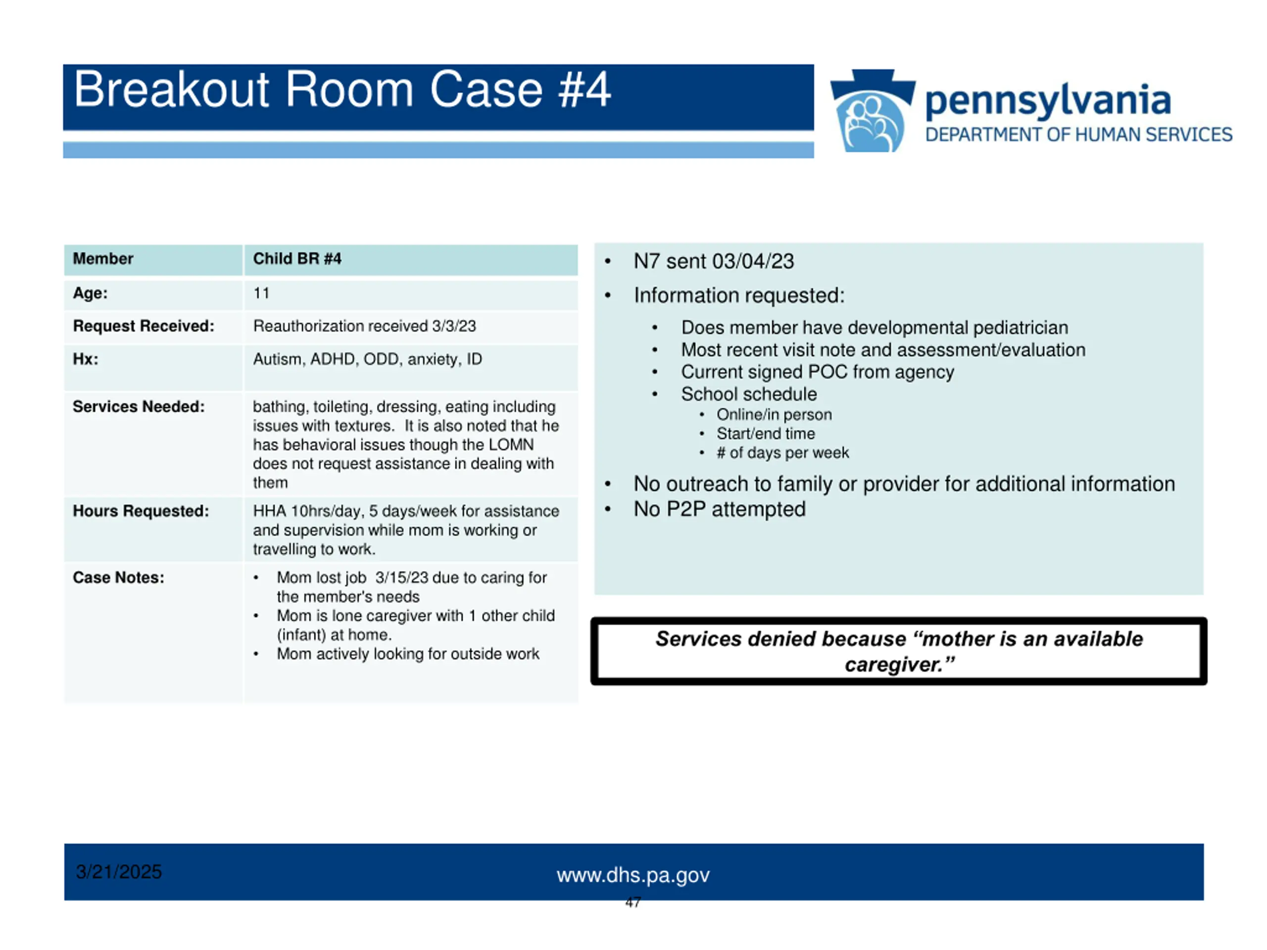 Breakout Room Case #4 N7 sent 03/04/23 Information requested: Does member have developmental pediatrician Most recent visit note and assessment/evaluation Current signed POC from agency School schedule Online/in person Start/end time # of days per week No outreach to family or provider for additional information No P2P attempted Member Child BR #4 11 Age: Reauthorization received 3/3/23 Request Received: Autism, ADHD, ODD, anxiety, ID Hx: bathing, toileting, dressing, eating including issues with textures. It is also noted that he has behavioral issues though the LOMN does not request assistance in dealing with them Services Needed: HHA 10hrs/day, 5 days/week for assistance and supervision while mom is working or travelling to work. Hours Requested: Mom lost job 3/15/23 due to caring for the member's needs Mom is lone caregiver with 1 other child (infant) at home. Mom actively looking for outside work Case Notes: Services denied because mother is an available caregiver. www.dpw.state.pa.us > > 3/21/2025 www.dhs.pa.gov 47