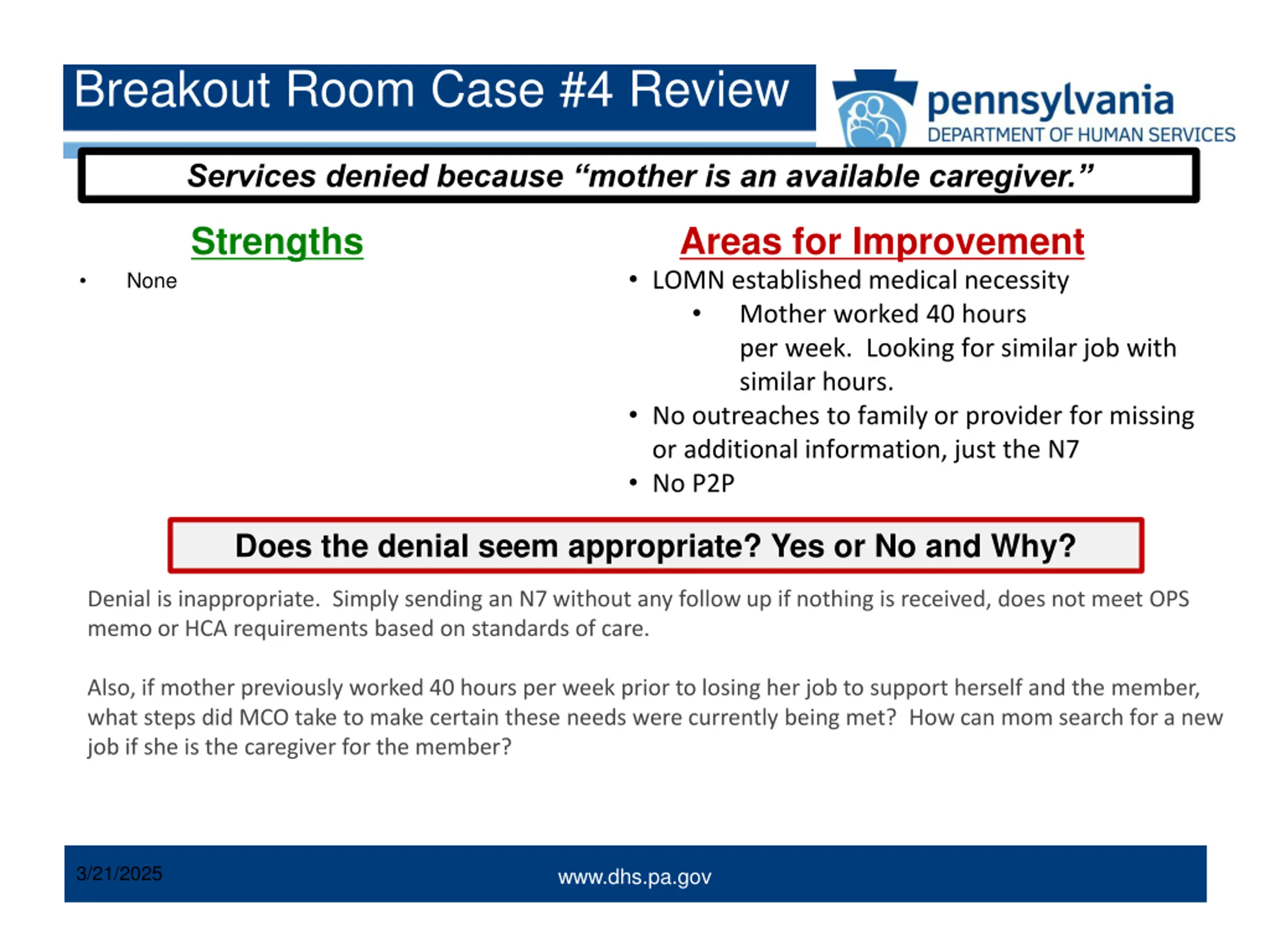 Breakout Room Case #4 Review Services denied because mother is an available caregiver. Strengths Areas for Improvement LOMN established medical necessity Mother worked 40 hours per week. Looking for similar job with similar hours. No outreaches to family or provider for missing or additional information, just the N7 No P2P None Does the denial seem appropriate? Yes or No and Why? Denial is inappropriate. Simply sending an N7 without any follow up if nothing is received, does not meet OPS memo or HCA requirements based on standards of care. Also, if mother previously worked 40 hours per week prior to losing her job to support herself and the member, what steps did MCO take to make certain these needs were currently being met? How can mom search for a new job if she is the caregiver for the member? 48 www.dpw.state.pa.us > > 3/21/2025 www.dhs.pa.gov