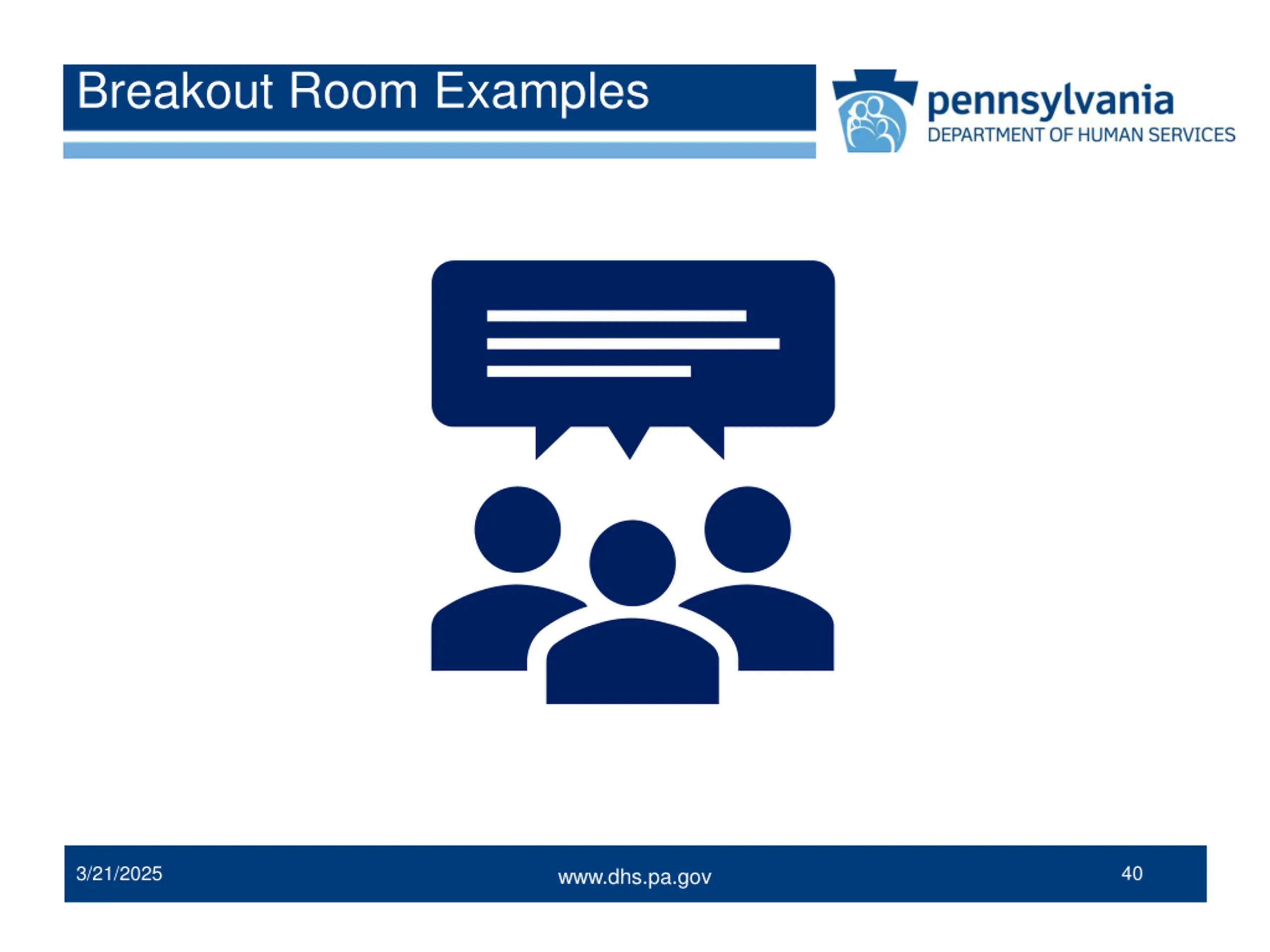 Breakout Room Examples www.dpw.state.pa.us > > 40 3/21/2025 www.dhs.pa.gov