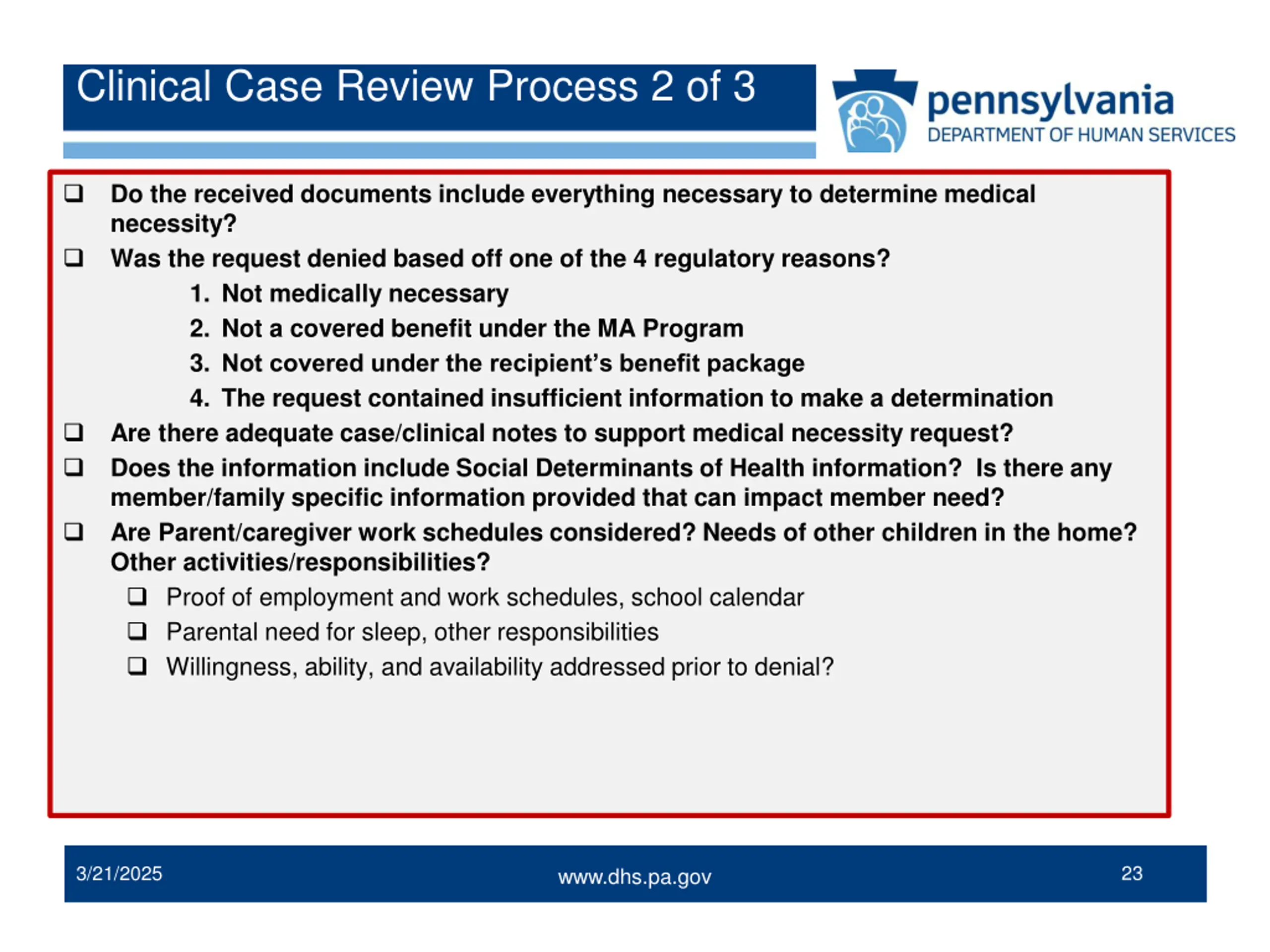 Clinical Case Review Process 2 of 3 Do the received documents include everything necessary to determine medical necessity? Was the request denied based off one of the 4 regulatory reasons? 1. Not medically necessary 2. Not a covered benefit under the MA Program 3. Not covered under the recipient s benefit package 4. The request contained insufficient information to make a determination Are there adequate case/clinical notes to support medical necessity request? Does the information include Social Determinants of Health information? Is there any member/family specific information provided that can impact member need? Are Parent/caregiver work schedules considered? Needs of other children in the home? Other activities/responsibilities? Proof of employment and work schedules, school calendar Parental need for sleep, other responsibilities Willingness, ability, and availability addressed prior to denial? www.dpw.state.pa.us > > 23 3/21/2025 www.dhs.pa.gov