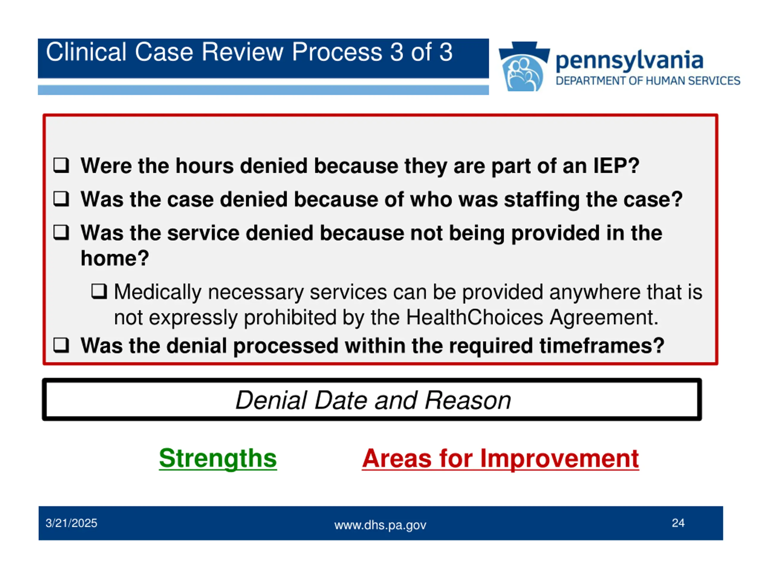 Clinical Case Review Process 3 of 3 Were the hours denied because they are part of an IEP? Was the case denied because of who was staffing the case? Was the service denied because not being provided in the home? Medically necessary services can be provided anywhere that is not expressly prohibited by the HealthChoices Agreement. Was the denial processed within the required timeframes? Denial Date and Reason Strengths Areas for Improvement www.dpw.state.pa.us > > 24 3/21/2025 www.dhs.pa.gov