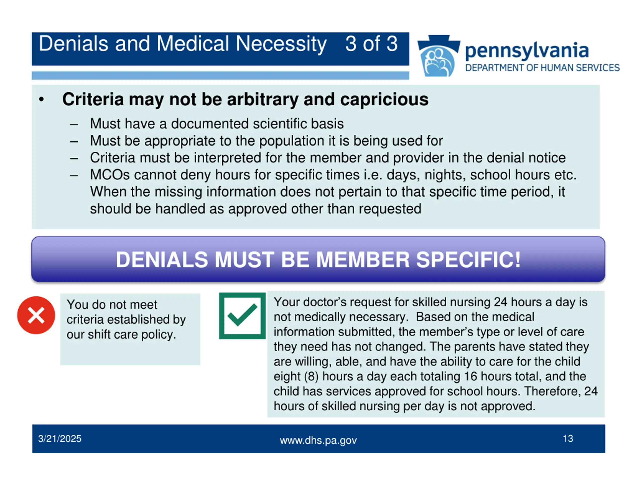 Denials and Medical Necessity 3 of 3 Criteria may not be arbitrary and capricious Must have a documented scientific basis Must be appropriate to the population it is being used for Criteria must be interpreted for the member and provider in the denial notice MCOs cannot deny hours for specific times i.e. days, nights, school hours etc. When the missing information does not pertain to that specific time period, it should be handled as approved other than requested DENIALS MUST BE MEMBER SPECIFIC! Your doctor s request for skilled nursing 24 hours a day is not medically necessary. Based on the medical information submitted, the member s type or level of care they need has not changed. The parents have stated they are willing, able, and have the ability to care for the child eight (8) hours a day each totaling 16 hours total, and the child has services approved for school hours. Therefore, 24 hours of skilled nursing per day is not approved. You do not meet criteria established by our shift care policy. www.dpw.state.pa.us > > 13 3/21/2025 www.dhs.pa.gov