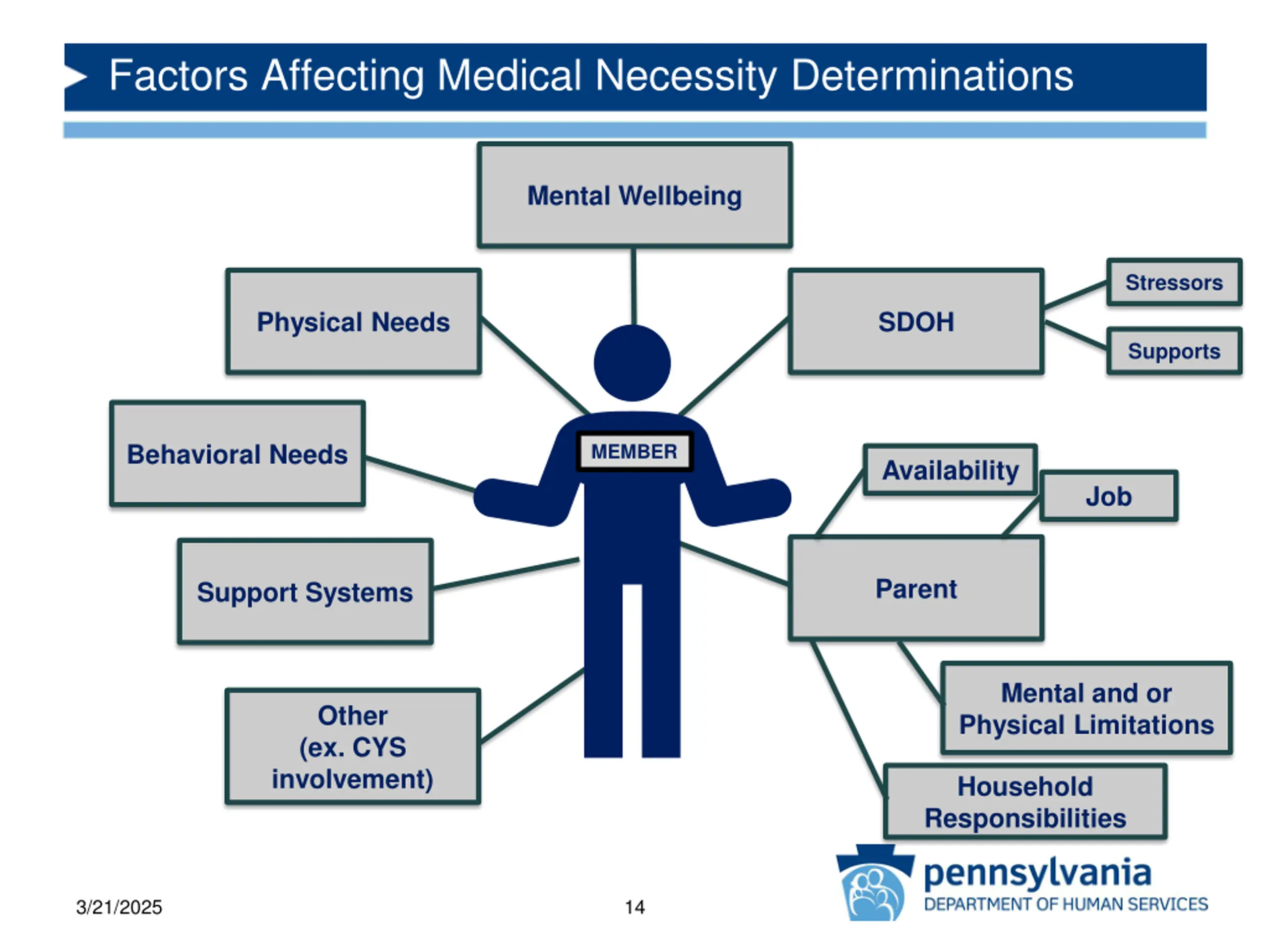 Factors Affecting Medical Necessity Determinations Mental Wellbeing Stressors Physical Needs SDOH Supports Behavioral Needs MEMBER Availability Job Parent Support Systems Mental and or Physical Limitations Other (ex. CYS involvement) Household Responsibilities 3/21/2025 14