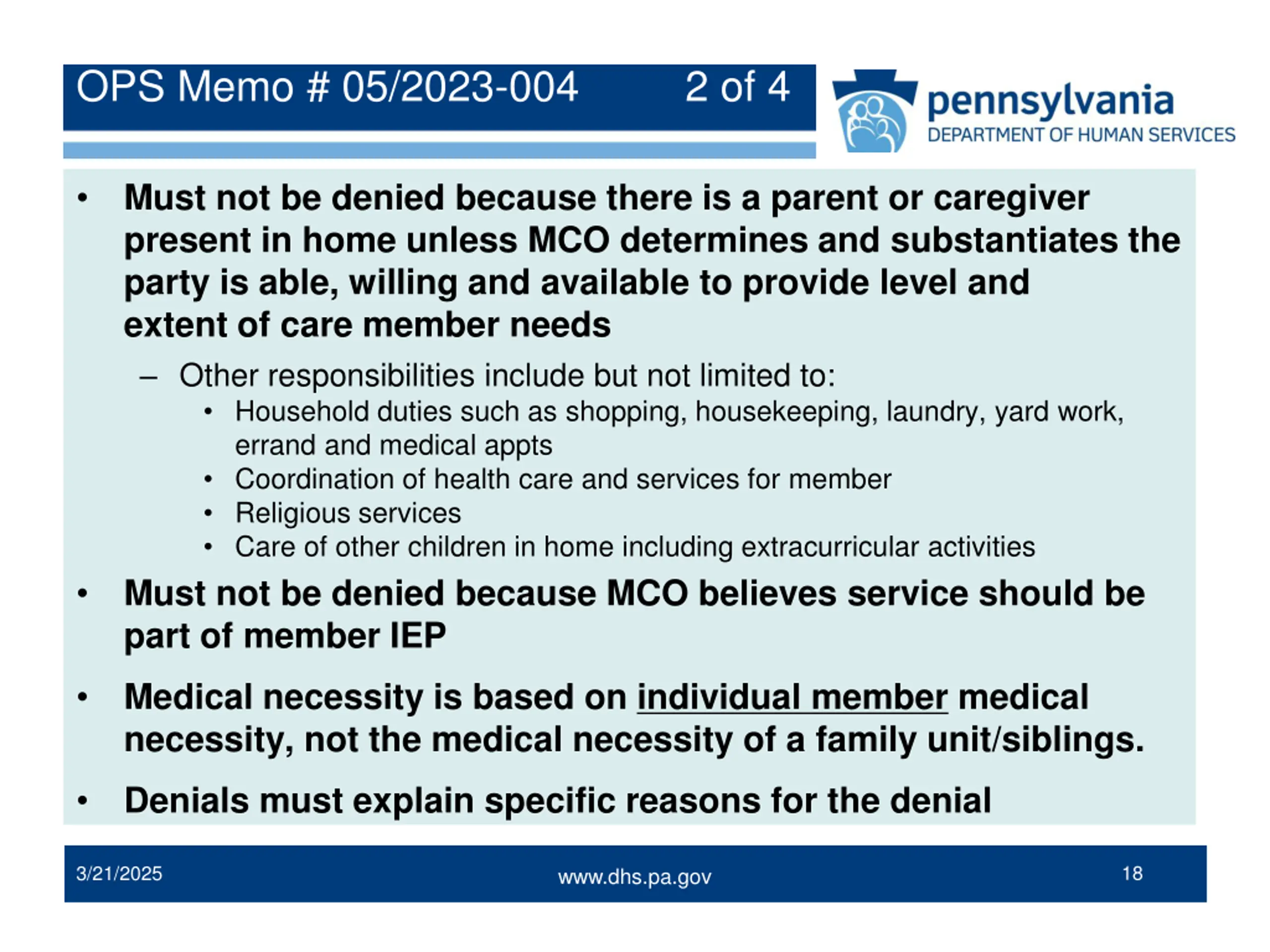OPS Memo # 05/2023-004 2 of 4 Must not be denied because there is a parent or caregiver present in home unless MCO determines and substantiates the party is able, willing and available to provide level and extent of care member needs Other responsibilities include but not limited to: Household duties such as shopping, housekeeping, laundry, yard work, errand and medical appts Coordination of health care and services for member Religious services Care of other children in home including extracurricular activities Must not be denied because MCO believes service should be part of member IEP Medical necessity is based on individual member medical necessity, not the medical necessity of a family unit/siblings. Denials must explain specific reasons for the denial www.dpw.state.pa.us > > 18 3/21/2025 www.dhs.pa.gov