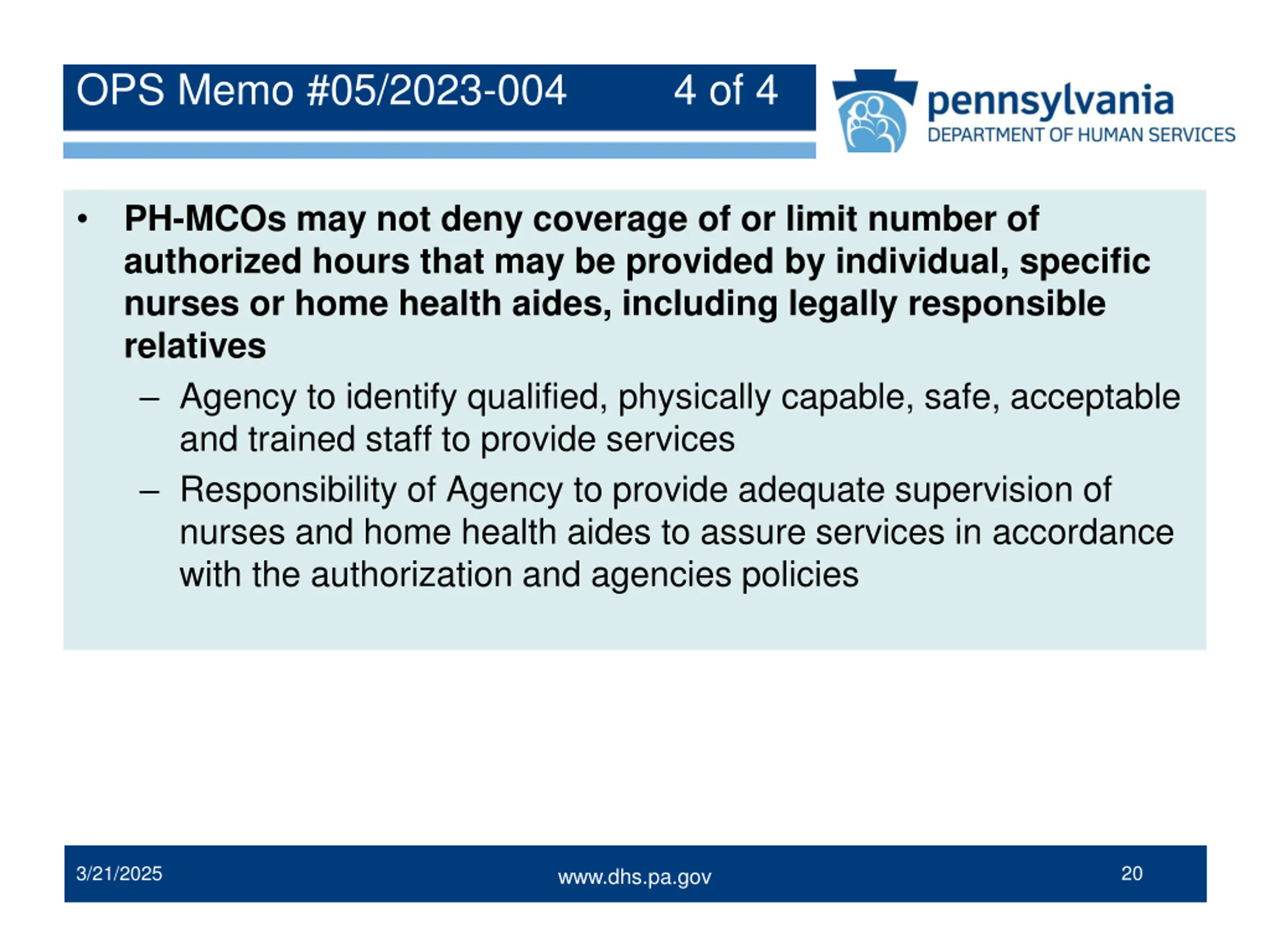 OPS Memo #05/2023-004 4 of 4 PH-MCOs may not deny coverage of or limit number of authorized hours that may be provided by individual, specific nurses or home health aides, including legally responsible relatives Agency to identify qualified, physically capable, safe, acceptable and trained staff to provide services Responsibility of Agency to provide adequate supervision of nurses and home health aides to assure services in accordance with the authorization and agencies policies www.dpw.state.pa.us > > 20 3/21/2025 www.dhs.pa.gov