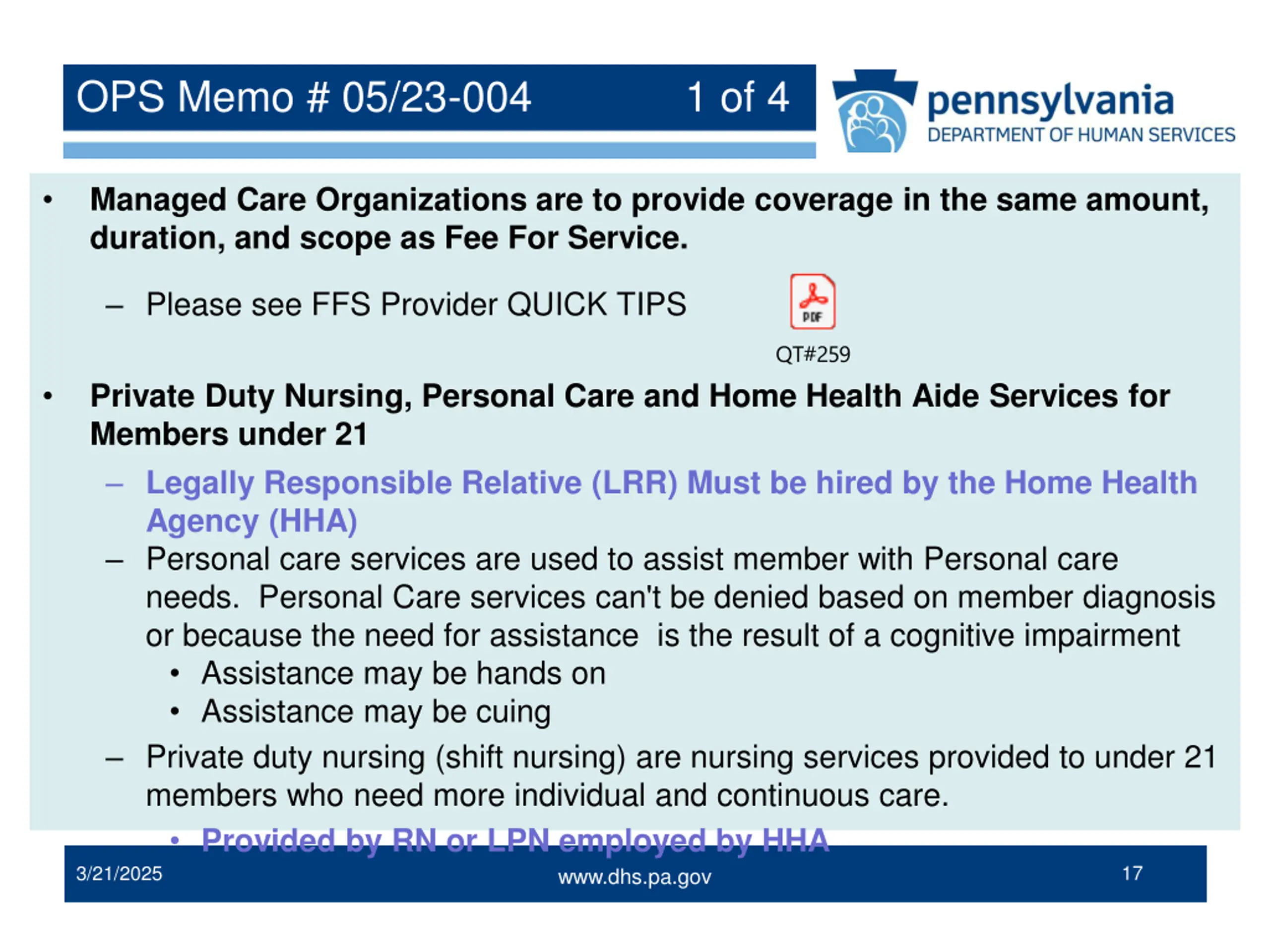 OPS Memo # 05/23-004 1 of 4 Managed Care Organizations are to provide coverage in the same amount, duration, and scope as Fee For Service. Please see FFS Provider QUICK TIPS QT#259 Private Duty Nursing, Personal Care and Home Health Aide Services for Members under 21 Legally Responsible Relative (LRR) Must be hired by the Home Health Agency (HHA) Personal care services are used to assist member with Personal care needs. Personal Care services can't be denied based on member diagnosis or because the need for assistance is the result of a cognitive impairment Assistance may be hands on Assistance may be cuing Private duty nursing (shift nursing) are nursing services provided to under 21 members who need more individual and continuous care. Provided by RN or LPN employed by HHA www.dpw.state.pa.us > > 17 3/21/2025 www.dhs.pa.gov