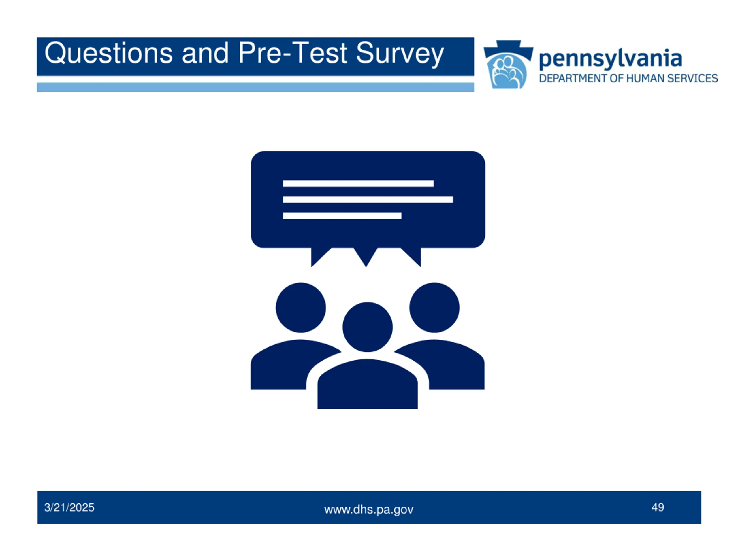 Questions and Pre-Test Survey www.dpw.state.pa.us > > 49 3/21/2025 www.dhs.pa.gov