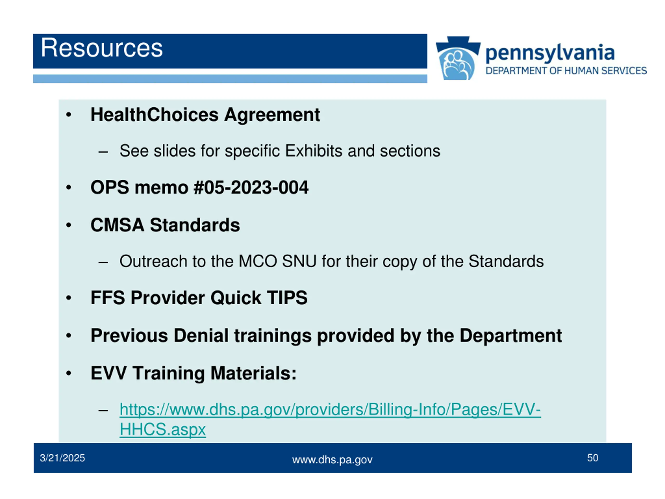 Resources HealthChoices Agreement See slides for specific Exhibits and sections OPS memo #05-2023-004 CMSA Standards Outreach to the MCO SNU for their copy of the Standards FFS Provider Quick TIPS Previous Denial trainings provided by the Department EVV Training Materials: https://www.dhs.pa.gov/providers/Billing-Info/Pages/EVV- HHCS.aspx www.dpw.state.pa.us > > 50 3/21/2025 www.dhs.pa.gov