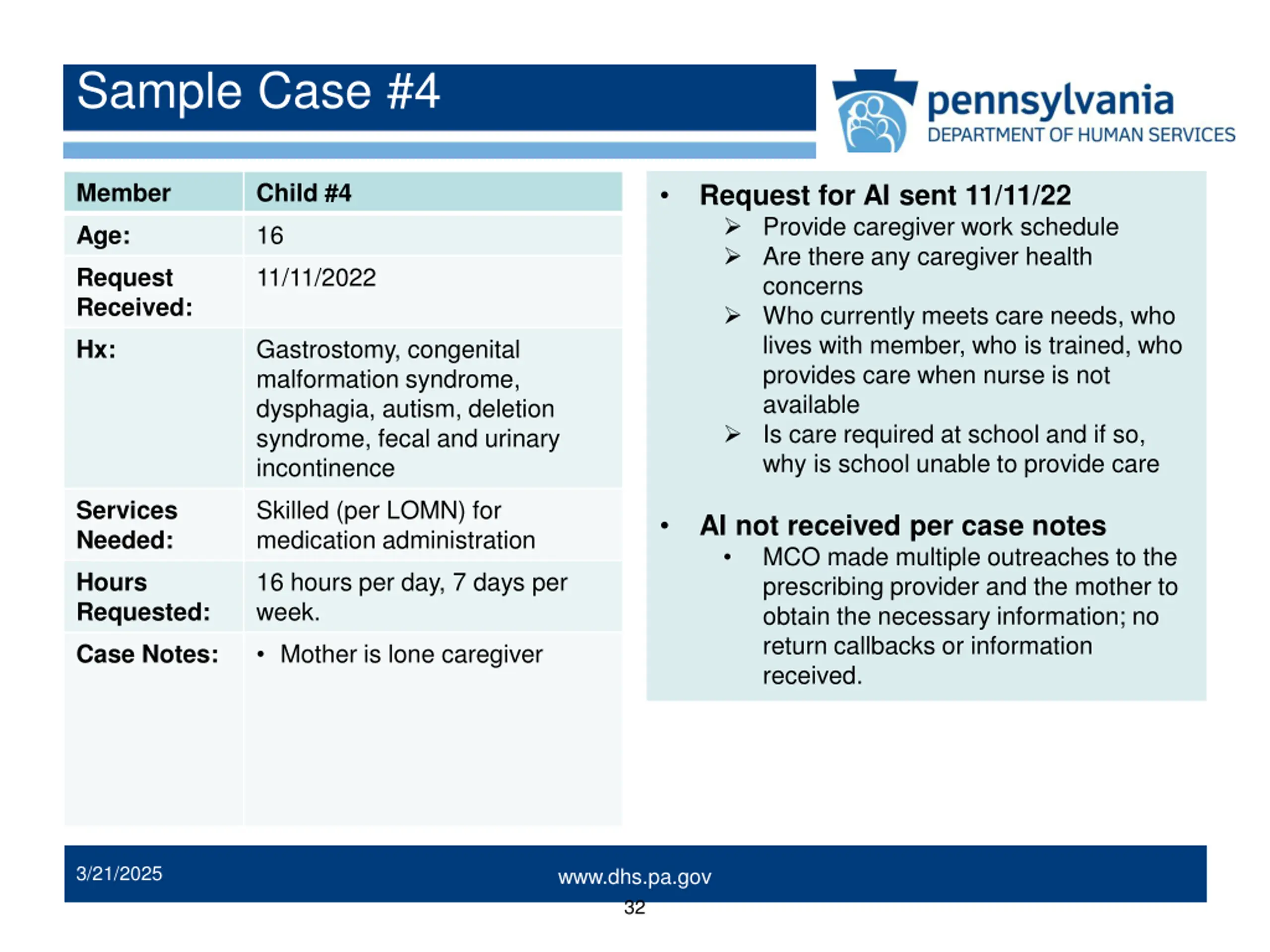 Sample Case #4 Member Child #4 Request for AI sent 11/11/22 Provide caregiver work schedule Are there any caregiver health concerns Who currently meets care needs, who lives with member, who is trained, who provides care when nurse is not available Is care required at school and if so, why is school unable to provide care 16 Age: 11/11/2022 Request Received: Gastrostomy, congenital malformation syndrome, dysphagia, autism, deletion syndrome, fecal and urinary incontinence Hx: Skilled (per LOMN) for medication administration Services Needed: AI not received per case notes MCO made multiple outreaches to the prescribing provider and the mother to obtain the necessary information; no return callbacks or information received. 16 hours per day, 7 days per week. Hours Requested: Mother is lone caregiver Case Notes: www.dpw.state.pa.us > > 3/21/2025 www.dhs.pa.gov 32