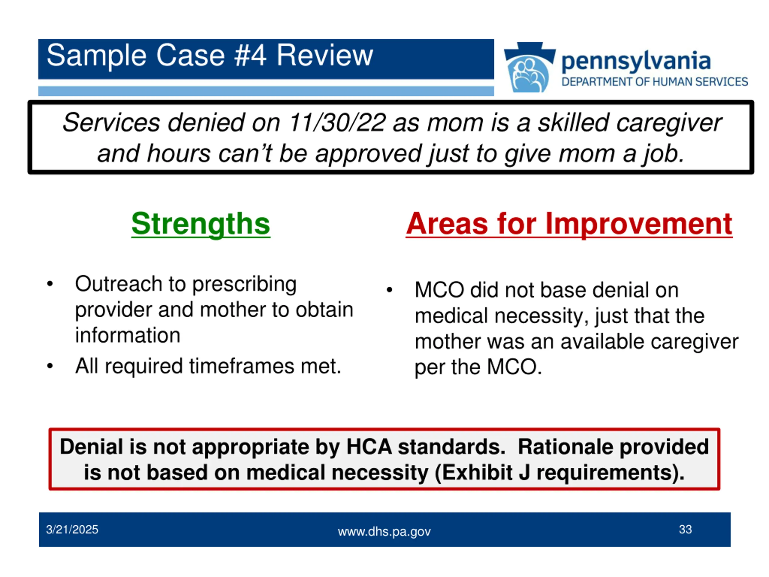 Sample Case #4 Review Services denied on 11/30/22 as mom is a skilled caregiver and hours can t be approved just to give mom a job. Strengths Areas for Improvement Outreach to prescribing provider and mother to obtain information All required timeframes met. MCO did not base denial on medical necessity, just that the mother was an available caregiver per the MCO. Denial is not appropriate by HCA standards. Rationale provided is not based on medical necessity (Exhibit J requirements). www.dpw.state.pa.us > > 33 3/21/2025 www.dhs.pa.gov