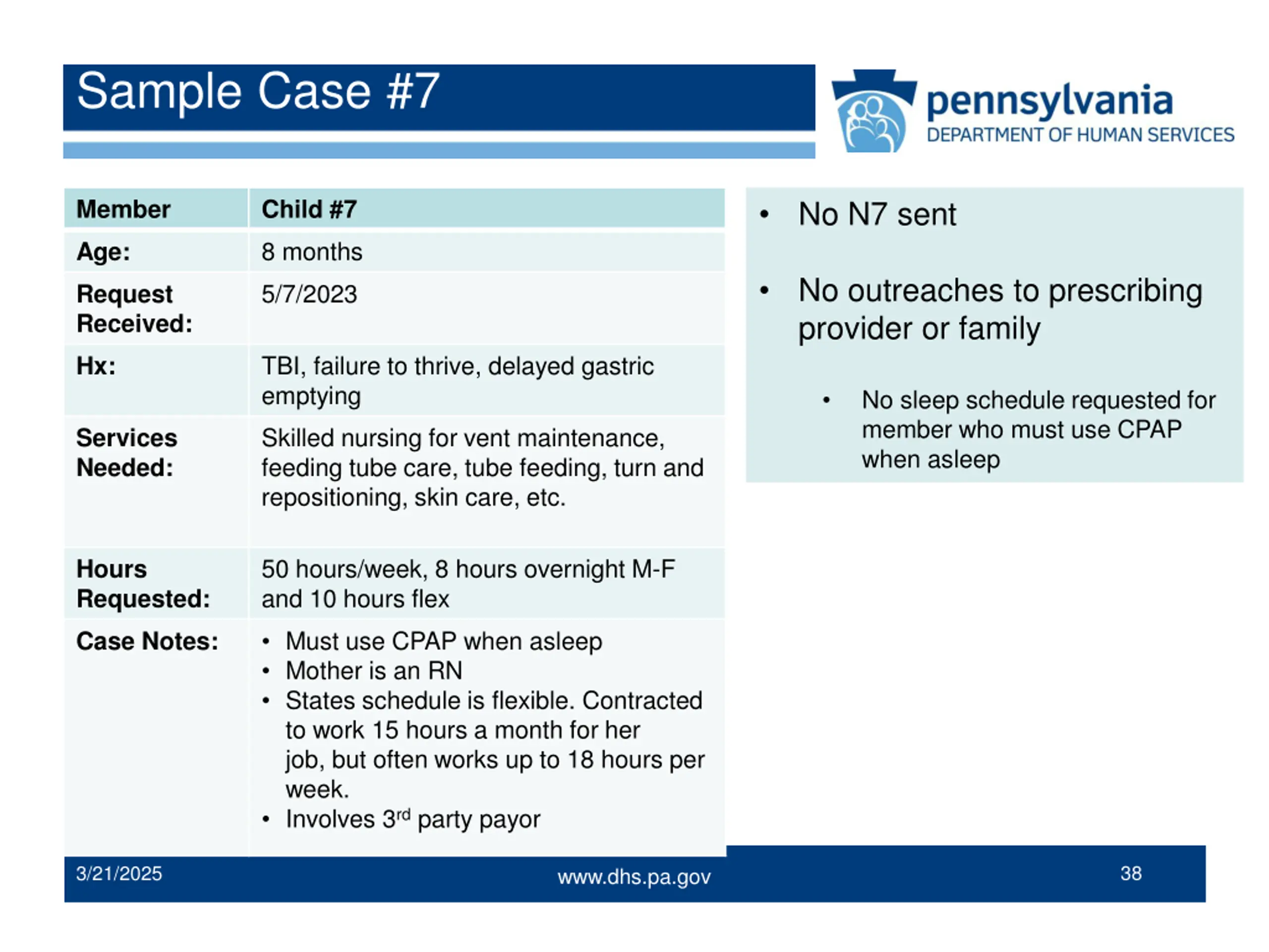 Sample Case #7 Member Child #7 No N7 sent 8 months Age: No outreaches to prescribing provider or family 5/7/2023 Request Received: TBI, failure to thrive, delayed gastric emptying Hx: No sleep schedule requested for member who must use CPAP when asleep Skilled nursing for vent maintenance, feeding tube care, tube feeding, turn and repositioning, skin care, etc. Services Needed: 50 hours/week, 8 hours overnight M-F and 10 hours flex Hours Requested: Must use CPAP when asleep Mother is an RN States schedule is flexible. Contracted to work 15 hours a month for her job, but often works up to 18 hours per week. Involves 3rd party payor Case Notes: www.dpw.state.pa.us > > 38 3/21/2025 www.dhs.pa.gov