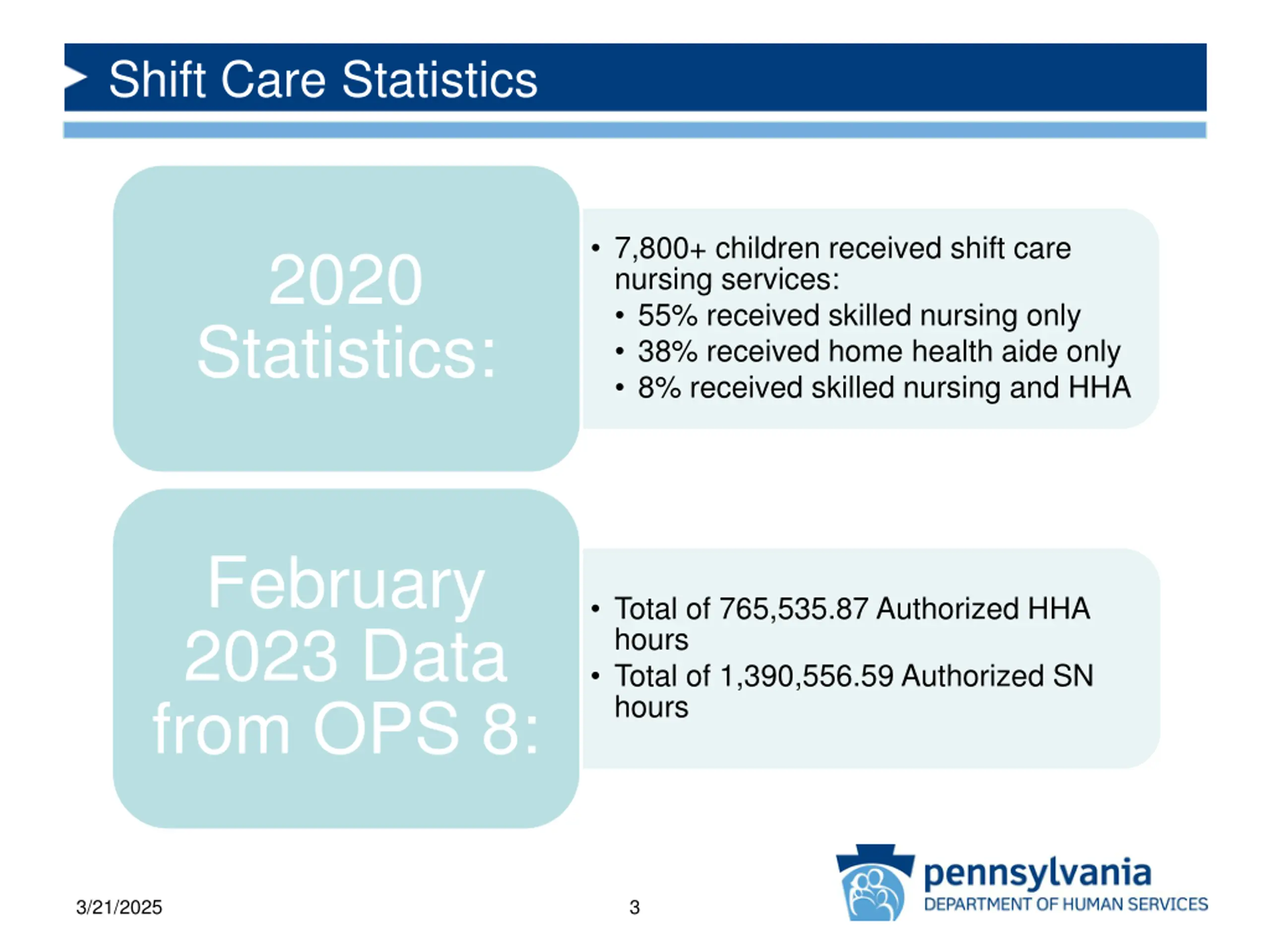 Shift Care Statistics 7,800+ children received shift care nursing services: 55% received skilled nursing only 38% received home health aide only 8% received skilled nursing and HHA 2020 Statistics: February 2023 Data from OPS 8: Total of 765,535.87 Authorized HHA hours Total of 1,390,556.59 Authorized SN hours 3/21/2025 3
