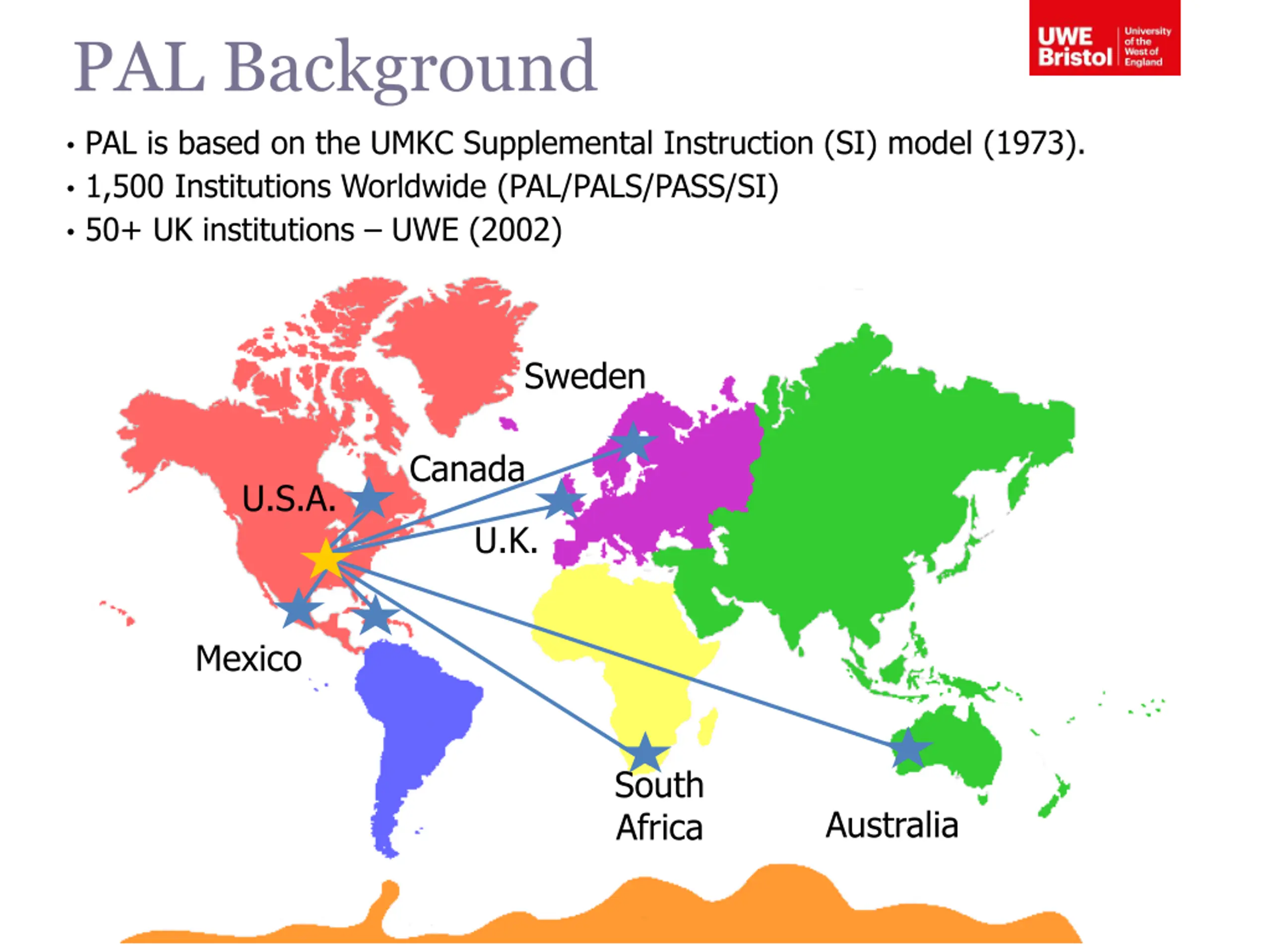 PAL Background PAL is based on the UMKC Supplemental Instruction (SI) model (1973). 1,500 Institutions Worldwide (PAL/PALS/PASS/SI) 50+ UK institutions UWE (2002) Sweden Canada U.S.A. U.K. Mexico South Africa Australia