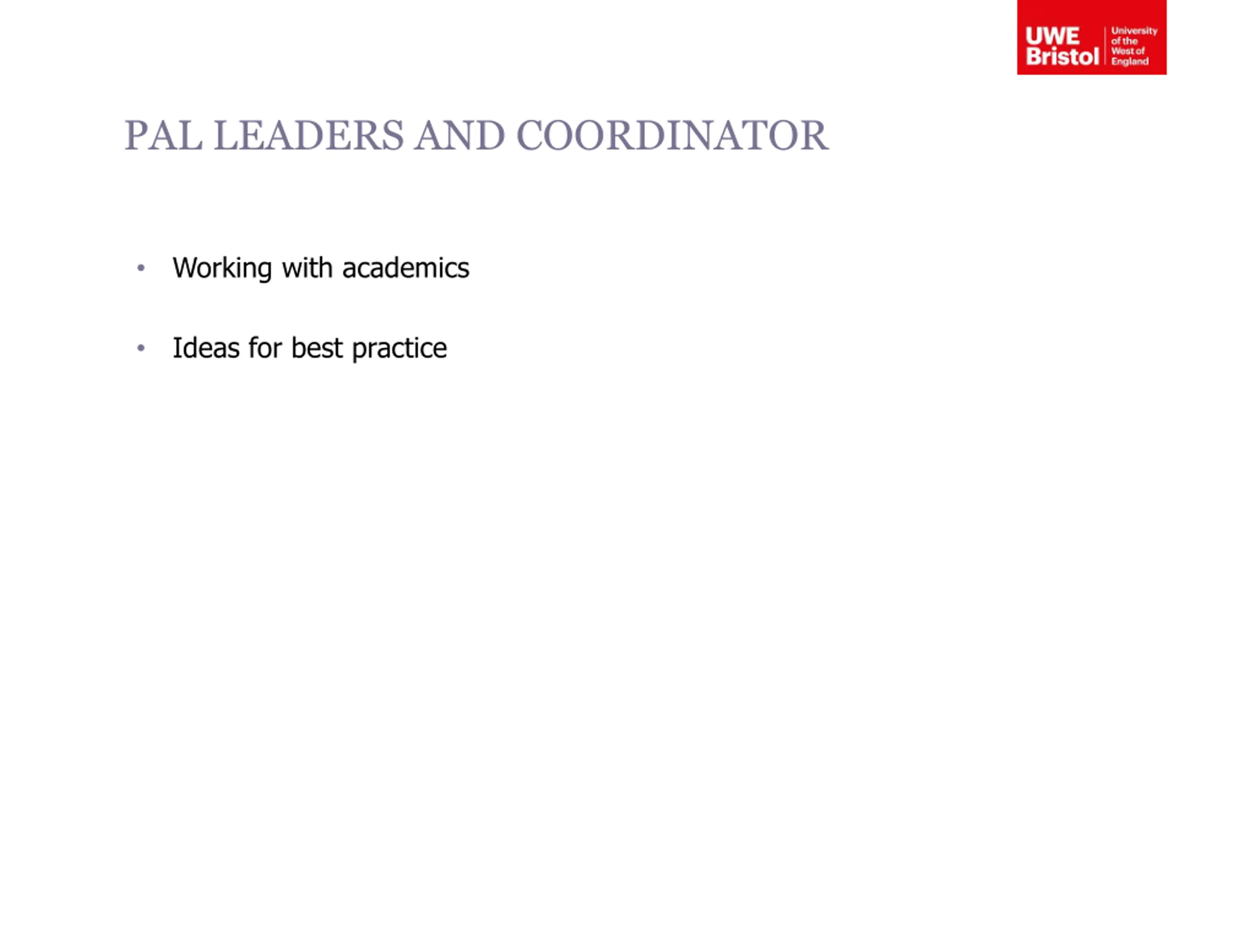 PAL LEADERS AND COORDINATOR Working with academics Ideas for best practice