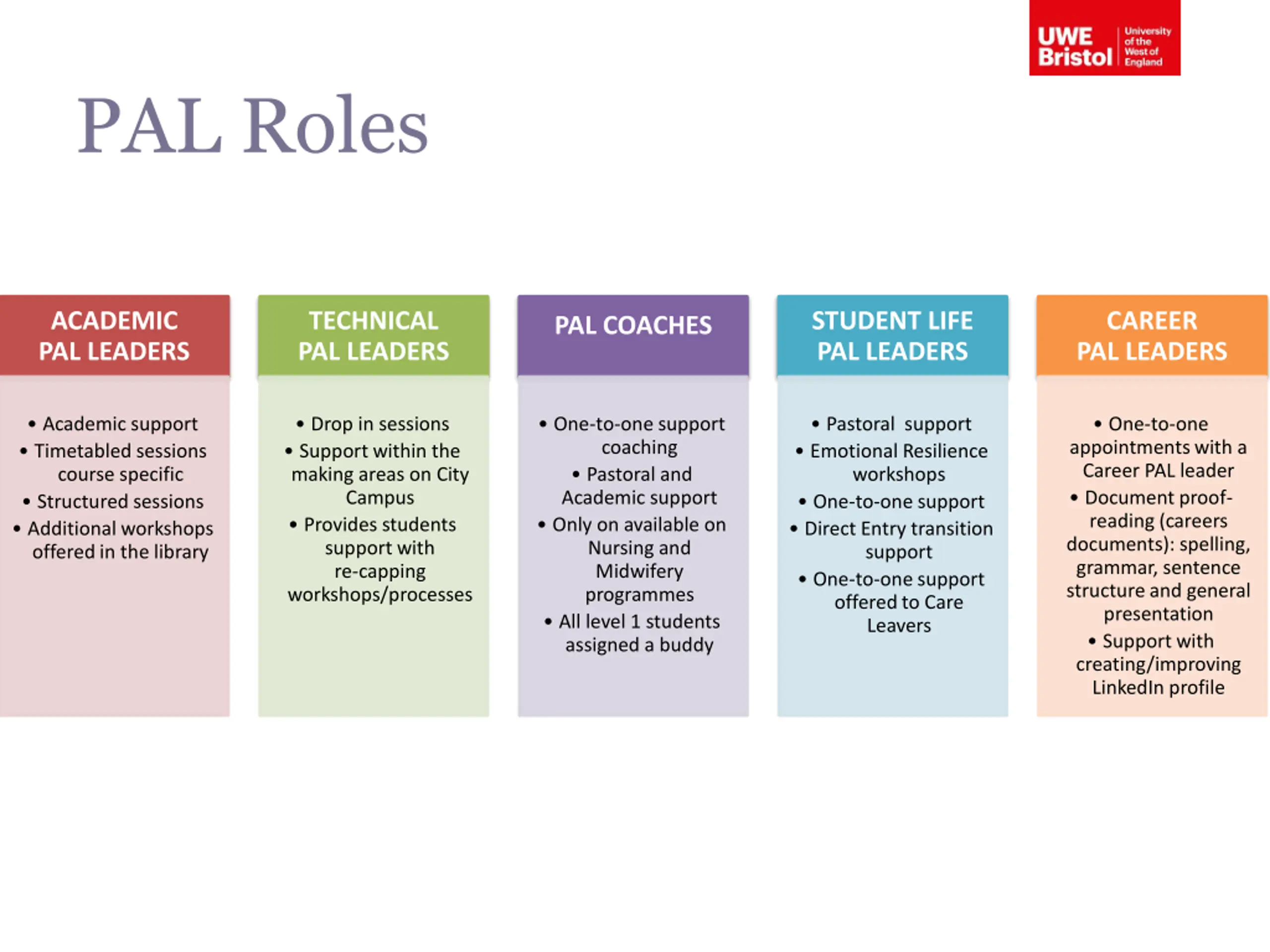 PAL Roles ACADEMIC PAL LEADERS TECHNICAL PAL LEADERS STUDENT LIFE PAL LEADERS CAREER PAL LEADERS PAL COACHES Academic support Timetabled sessions course specific Structured sessions Additional workshops offered in the library Drop in sessions Support within the making areas on City Campus Provides students support with re-capping workshops/processes One-to-one support coaching Pastoral and Academic support Only on available on Nursing and Midwifery programmes All level 1 students assigned a buddy Pastoral support Emotional Resilience workshops One-to-one support Direct Entry transition support One-to-one support offered to Care Leavers One-to-one appointments with a Career PAL leader Document proof- reading (careers documents): spelling, grammar, sentence structure and general presentation Support with creating/improving LinkedIn profile