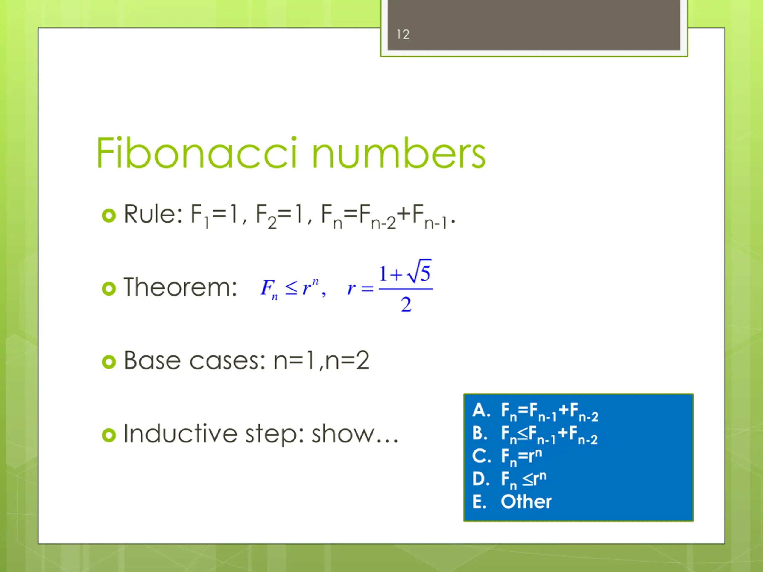 12 Fibonacci numbers Rule: F1=1, F2=1, Fn=Fn-2+Fn-1. + 1 5 Theorem: = n , n F r r 2 Base cases: n=1,n=2 A. Fn=Fn-1+Fn-2 B. Fn Fn-1+Fn-2 C. Fn=rn D. Fn rn E. Other Inductive step: show
