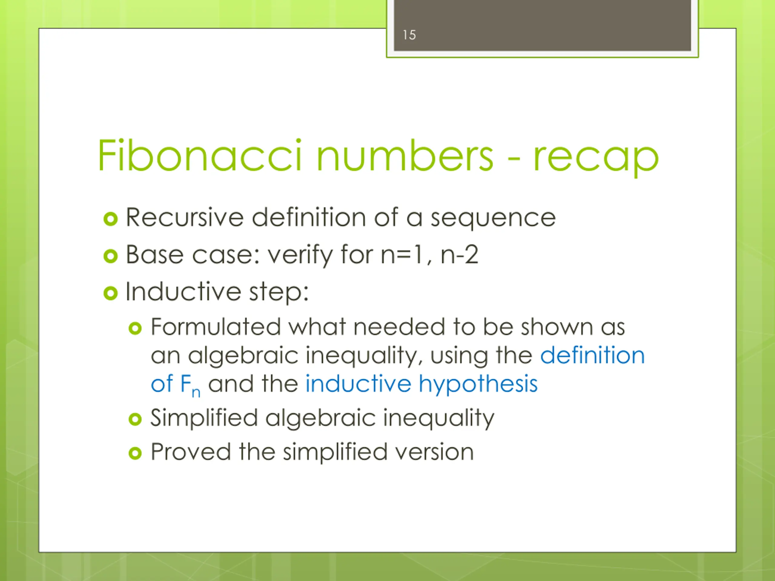 15 Fibonacci numbers - recap Recursive definition of a sequence Base case: verify for n=1, n-2 Inductive step: Formulated what needed to be shown as an algebraic inequality, using the definition of Fn and the inductive hypothesis Simplified algebraic inequality Proved the simplified version