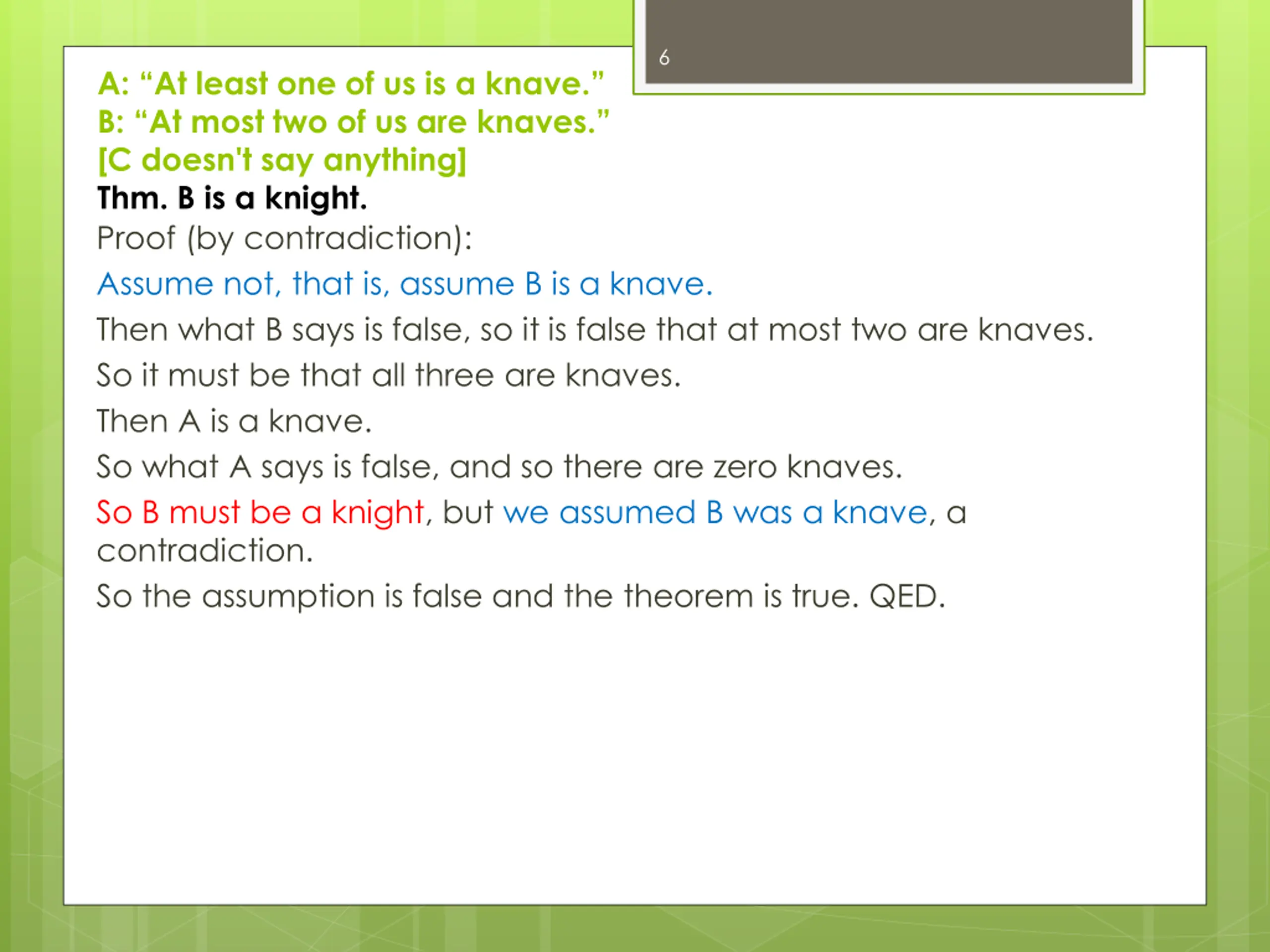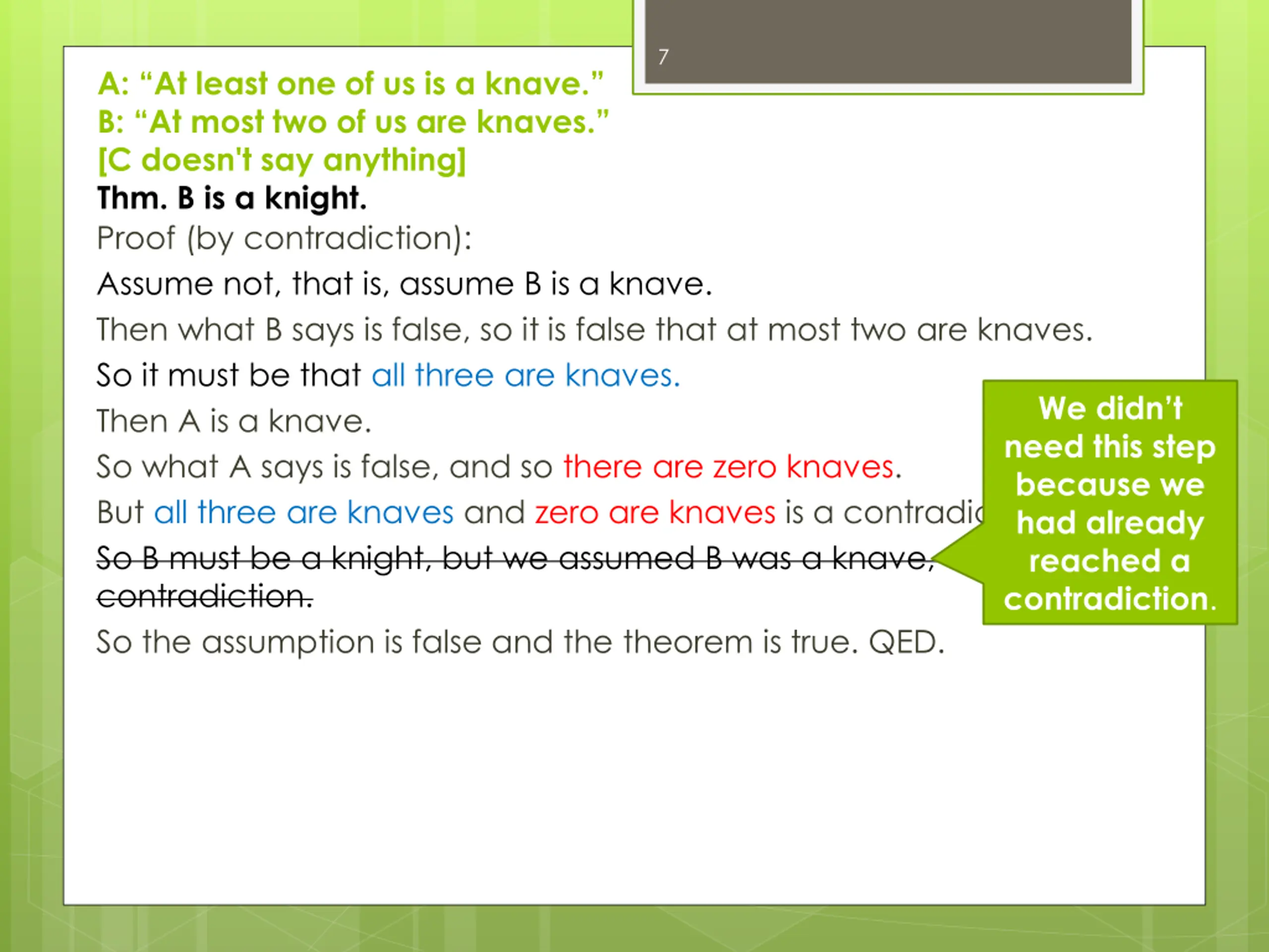 6 A: At least one of us is a knave. B: At most two of us are knaves. [C doesn't say anything] Thm. B is a knight. Proof (by contradiction): Assume not, that is, assume B is a knave. Then what B says is false, so it is false that at most two are knaves. So it must be that all three are knaves. Then A is a knave. So what A says is false, and so there are zero knaves. So B must be a knight, but we assumed B was a knave, a contradiction. So the assumption is false and the theorem is true. QED.