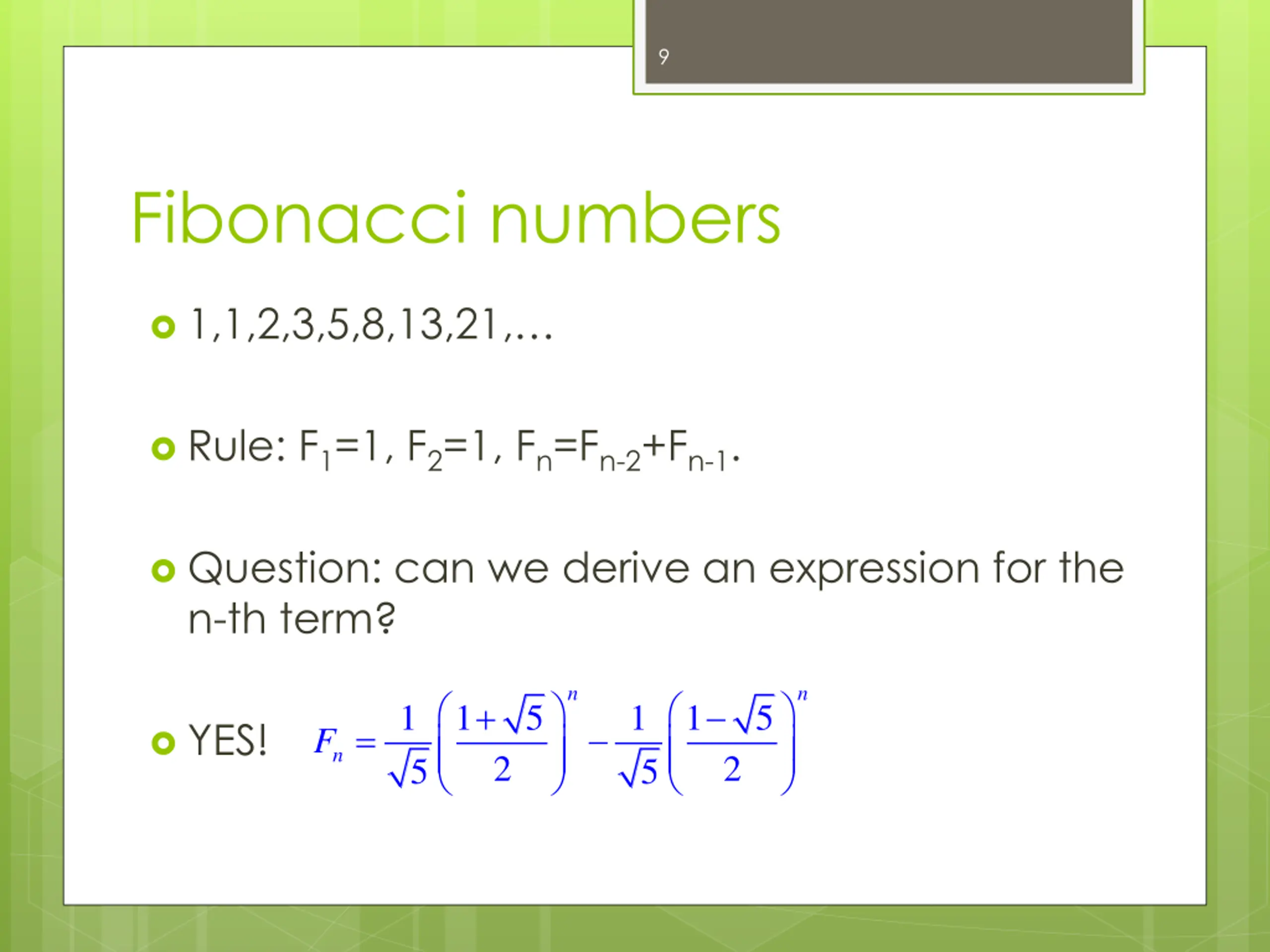 9 Fibonacci numbers 1,1,2,3,5,8,13,21, Rule: F1=1, F2=1, Fn=Fn-2+Fn-1. Question: can we derive an expression for the n-th term? n n + 1 1 5 1 1 5 YES! = n F 2 2 5 5