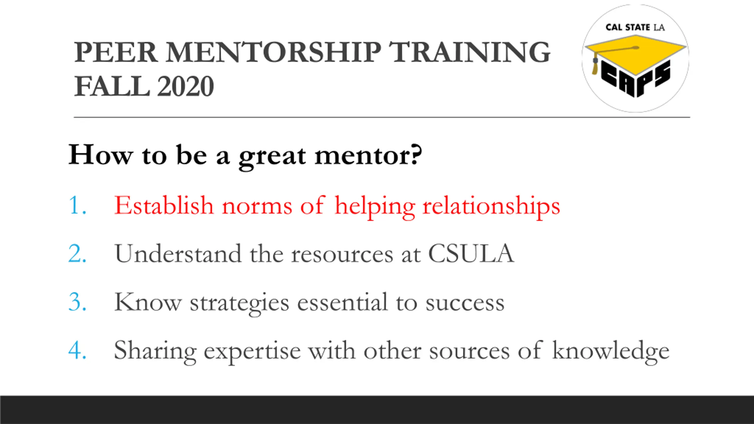 PEER MENTORSHIP TRAINING FALL 2021 How to be a great mentor? 1. Establish norms of helping relationships 2. Understand the resources at CSULA 3. Know strategies essential to success 4. Sharing expertise with other sources of knowledge